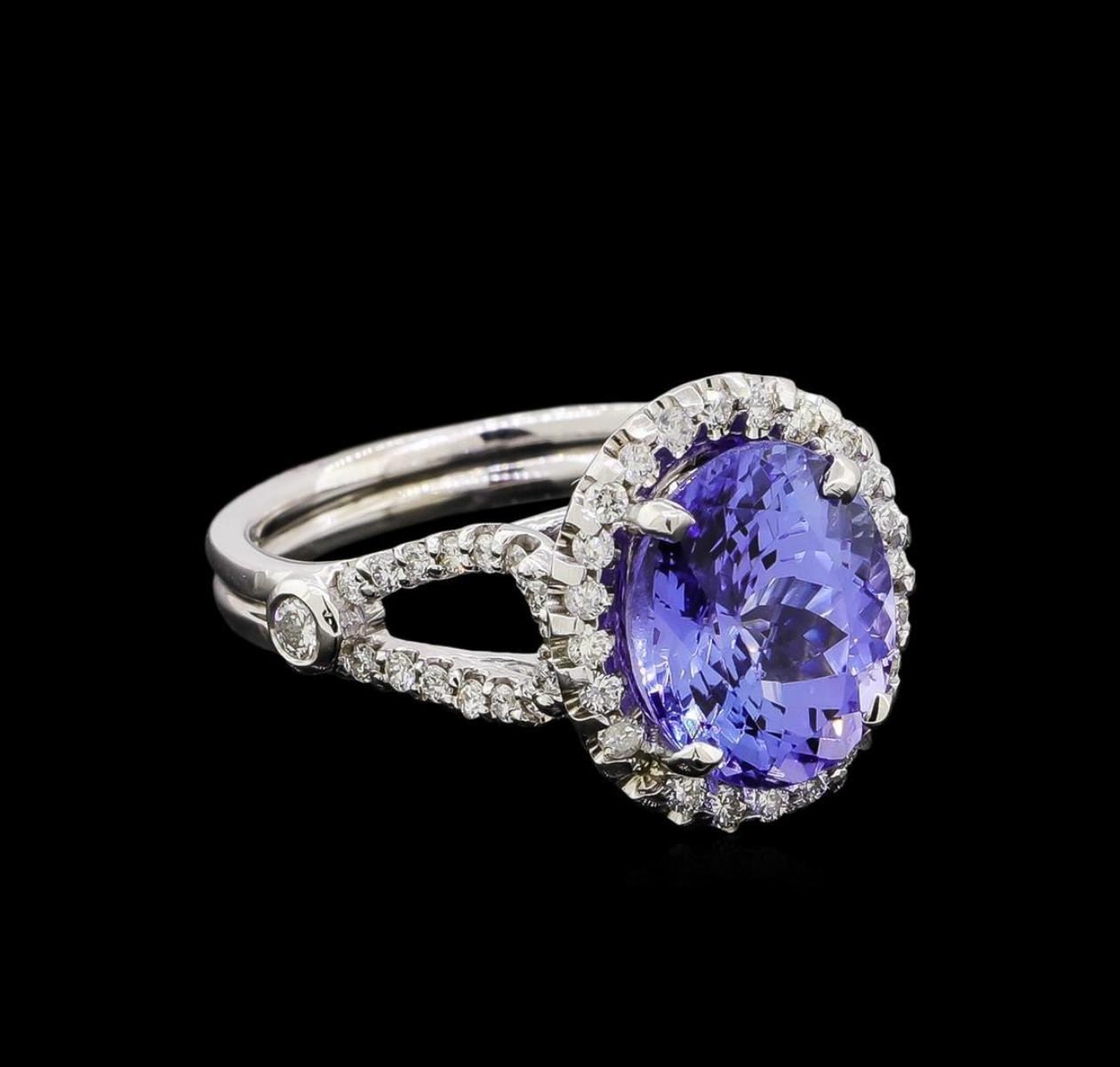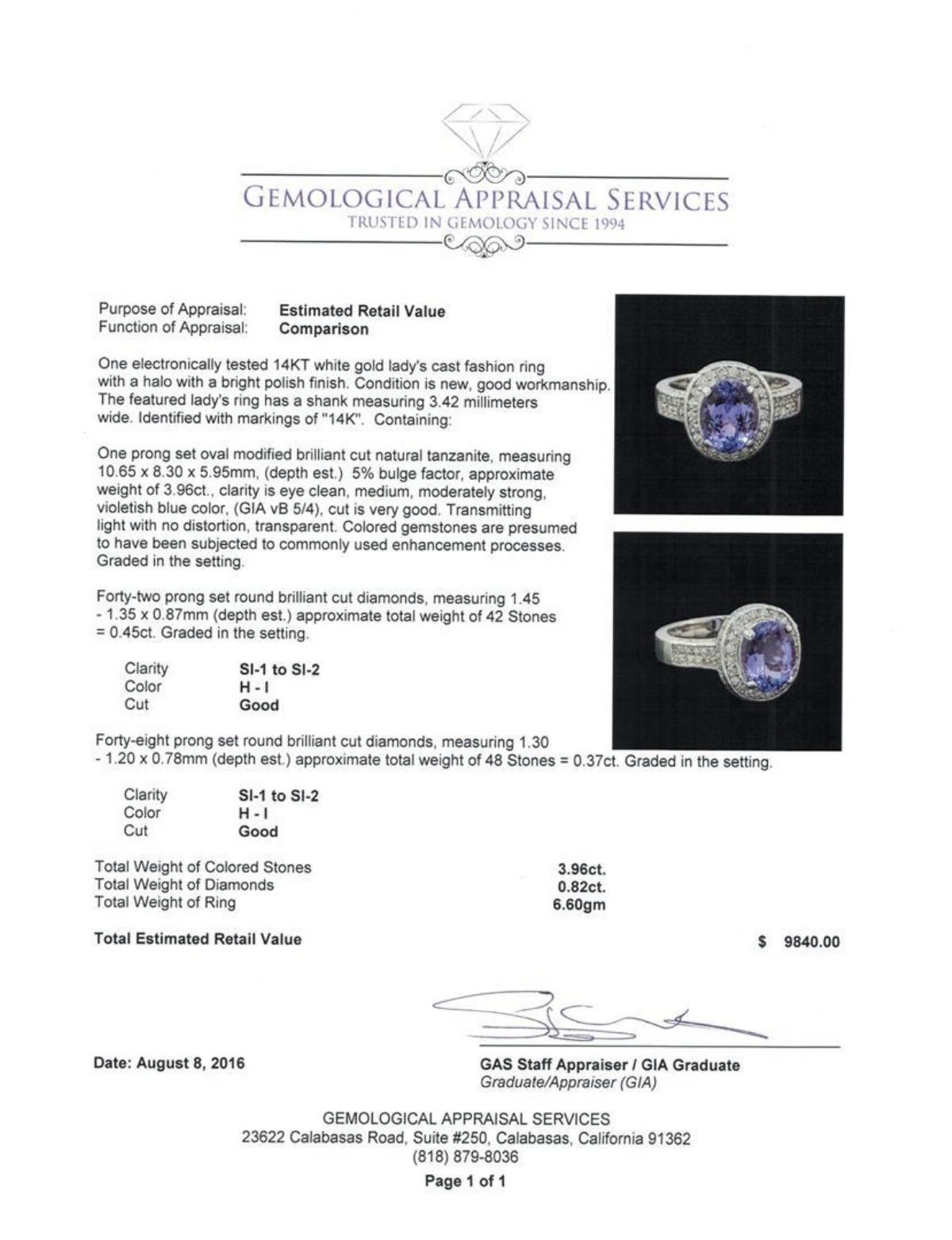 One electronically tested 14KT white gold lady's cast fashion ring with a halo with a bright polish finish. The featured lady's ring has a shank measuring 3.42 millimeters wide. Identified with markings of '14K'. Condition is new, good workmanship. Containing: One prong set oval modified brilliant cut natural tanzanite, measuring 10.65 x 8.30 x 5.95mm, (depth est.) 5%. bulge factor, approximate weight of 3.96ct., clarity is eye clean, medium, moderately strong, violetish blue color, (GIA vB 5/4), cut is very good. Transmitting light with no distortion, transparent. Colored gemstones are presumed to have been subjected to commonly used enhancement processes. Graded in the setting. Forty-Two prong set round brilliant cut diamonds, measuring 1.45 - 1.35 x 0.87mm (depth est.) approximate total weight of 42 Stones = 0.45ct. Graded in the setting. Clarity SI-1 to SI-2. Color: H - I Cut Good Forty-Eight prong set round brilliant cut diamonds, measuring 1.30 - 1.20 x 0.78mm (depth est.) approximate total weight of 48 Stones = 0.37ct. Graded in the setting. Clarity SI-1 to SI-2. Color: H - I Cut Good. Total Weight of Colored Stones 3.96ct.. Total Weight of Diamonds 0.82ct.. Total Weight of Ring 6.60gm.