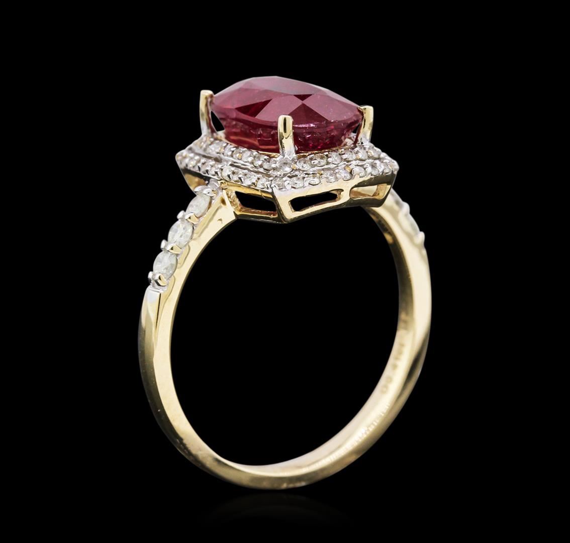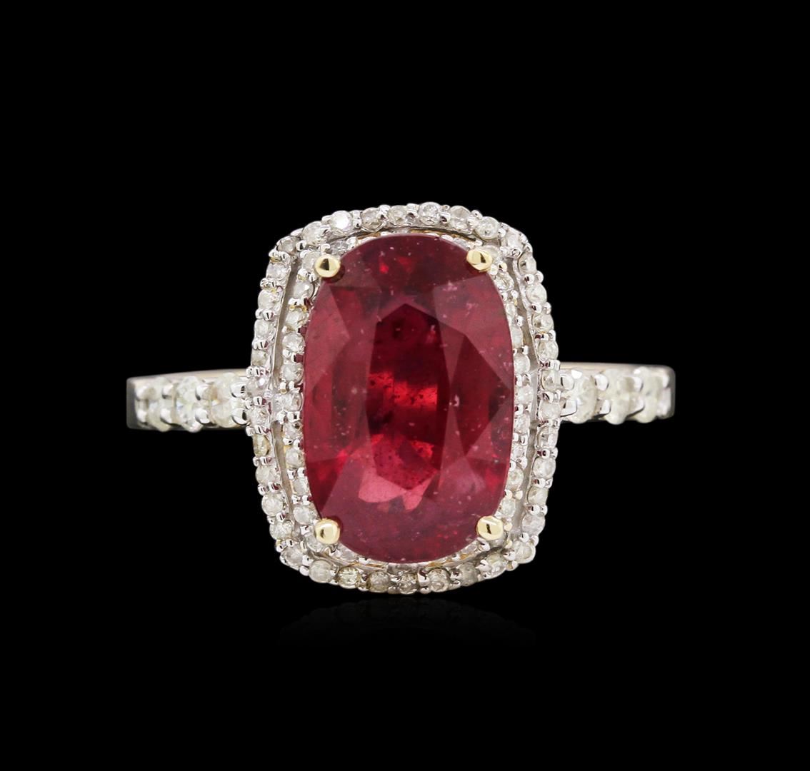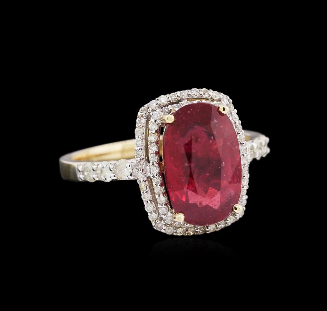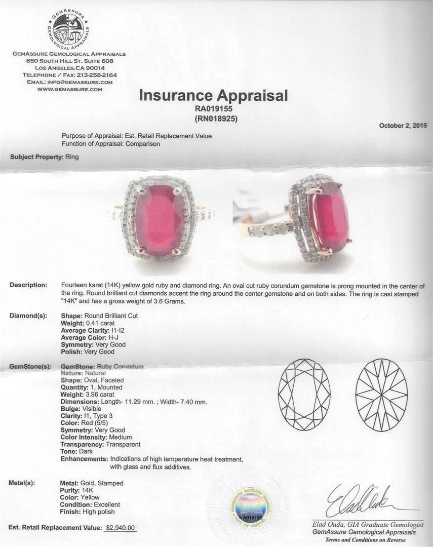 Fourteen karat (14K) yellow gold ruby and diamond ring. An oval cut ruby corundum gemstone is prong mounted in the center of the ring. Round brilliant cut diamonds accent the ring around the center gemstone and on both sides. The ring is cast stamped "14K" and has a gross weight of 3.6 Grams. Diamond(s): Shape: Round Brilliant Cut. Weight: 0.41 carat. Average Clarity: I1-I2. Average Color: H-J. Symmetry: Very Good. Polish: Very Good. Gemstone(s): GemStone: Ruby Corundum. Nature: Natural. Shape: Oval, Faceted. Quantity: 1, Mounted. Weight 3.96 carat. Dimensions: Length-11.29 mm. ; Width- 7.40 mm. Bulge: Visible. Clarity: I1, Type 3. Color: Red (5/5). Symmetry: Very Good. Color Intensity: Medium. Transparency: Transparent. Tone: Dark. Enhancements: Indications of high temperature heat treatment, with glass and flux additives. Metal(s): Metal: Gold, Stamped. Purity: 14K. Color: Yellow. Condition: Excellent. Finish: High polish. GGA Appraised.