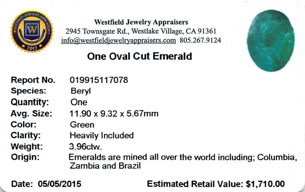 One oval mixed cut natural emerald, measuring 11.90 x 9.32 x 5.67mm, approximate weight of 3.96ct., clarity is heavily included, type III, medium dark, very slightly grayish, green color, (GIA G 6/3), cut is good. Indications of multiple laboratory enhancements, including high temperature heat treatment. Westfield Appraised at $1,710.00.