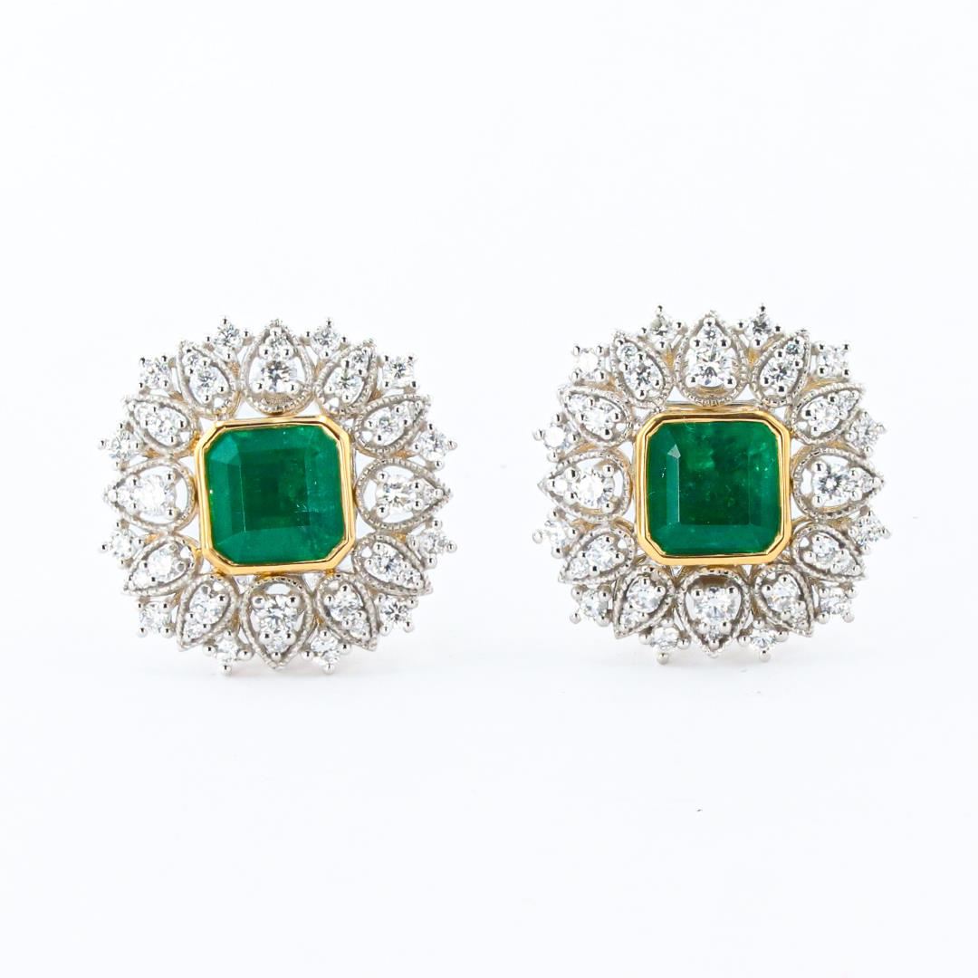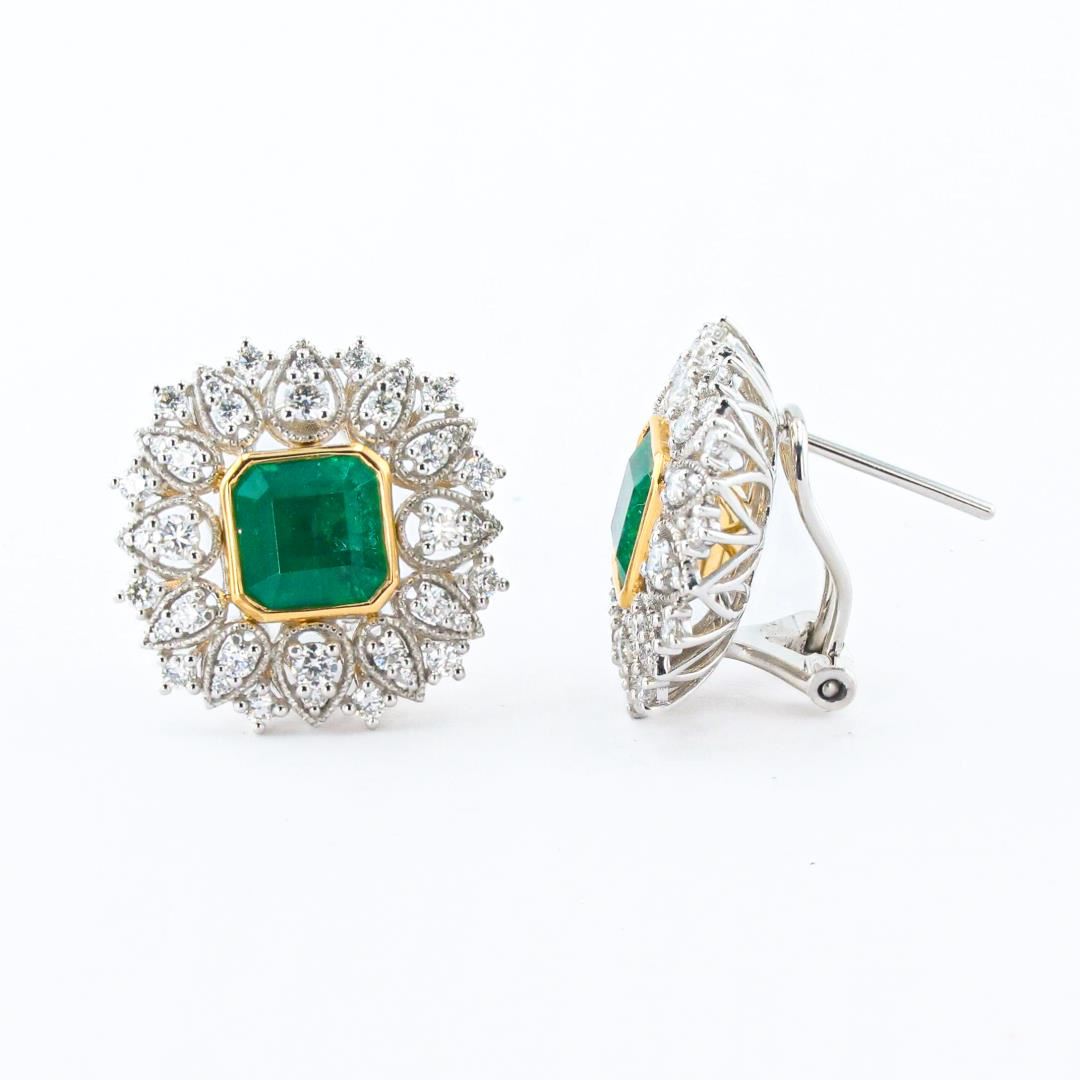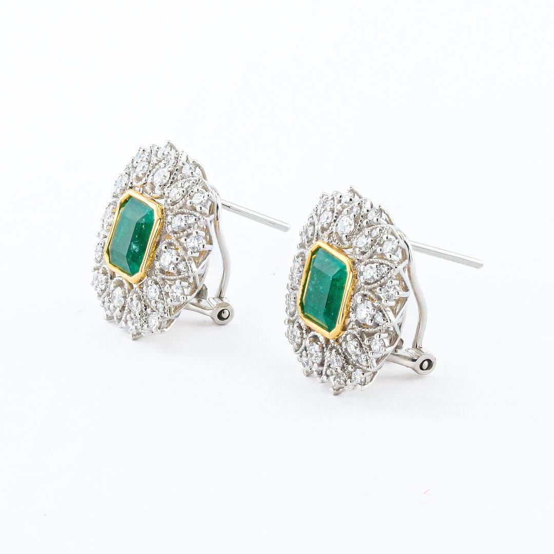 One electronically tested pair of platinum & 18K yellow gold earrings marked Oscar Friedman. The earrings are mounted with: 2 genuine emerald center stones weighing approximately 3.97 carats, and 72 genuine round diamonds weighing approximately 1.17 carats. This item weighs 11.4 grams, condition is new, excellent workmanship. #MAIN GEMSTONES# Species: Natural Beryl Variety: Emerald Shape: Octagonal Cutting Style: Step Cut Quantity: 2 Emeralds Measurements: 7 x 7mm Total Weight: 3.97 carats Color: Green Cut Grade: Very Good Refractive Index: 1.564 - 1.595 DR Birefringence: 0.005 to 0.009 Hardness: 7.5 - 8 #ADJACENT GEMSTONES ON EARRINGS# Identity: Natural Diamond Shape: Round Cutting Style: Brilliant Cut Quantity: 72 Diamonds Measurements: 1.1 - 2.1mm Total Weight: 1.17 carats Color Grade: G-H Clarity Grade: VS1-SI1 Refractive Index: 2.417 Hardness: 10 TOTAL EMERALD WEIGHT: 3.97 cts TOTAL DIAMOND WEIGHT: 1.17 cts WEIGHT OF ITEM: 11.4 grams METAL: Platinum & 18K Gold
