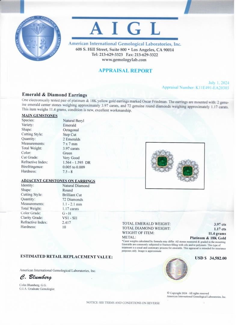 One electronically tested pair of platinum & 18K yellow gold earrings marked Oscar Friedman. The earrings are mounted with: 2 genuine emerald center stones weighing approximately 3.97 carats, and 72 genuine round diamonds weighing approximately 1.17 carats. This item weighs 11.4 grams, condition is new, excellent workmanship. #MAIN GEMSTONES# Species: Natural Beryl Variety: Emerald Shape: Octagonal Cutting Style: Step Cut Quantity: 2 Emeralds Measurements: 7 x 7mm Total Weight: 3.97 carats Color: Green Cut Grade: Very Good Refractive Index: 1.564 - 1.595 DR Birefringence: 0.005 to 0.009 Hardness: 7.5 - 8 #ADJACENT GEMSTONES ON EARRINGS# Identity: Natural Diamond Shape: Round Cutting Style: Brilliant Cut Quantity: 72 Diamonds Measurements: 1.1 - 2.1mm Total Weight: 1.17 carats Color Grade: G-H Clarity Grade: VS1-SI1 Refractive Index: 2.417 Hardness: 10 TOTAL EMERALD WEIGHT: 3.97 cts TOTAL DIAMOND WEIGHT: 1.17 cts WEIGHT OF ITEM: 11.4 grams METAL: Platinum & 18K Gold