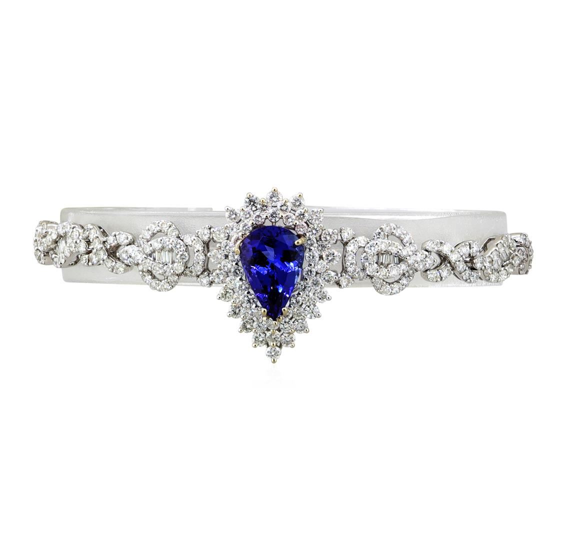 One electronically tested 18KT white gold ladies cast & assembled tanzanite and diamond bracelet with a bright polish finish. Seven inch length bracelet features a tanzanite set within an elaborate diamond lattice gallery supported by a flexible diamond set ribbon transitioning into matching white gold links, terminating in a concealed clasp with twin safeties. Identified with markings of "18K 750". Condition is new, good workmanship. Containing: One prong set pear mixed cut natural tanzanite, measuring 12.60 x 8.40 x 5.45mm, approximate weight of 3.97ct., clarity is eye clean, type I, dark, moderately strong, violetish blue color, (GIA vB 7/4), cut is good. Transmitting light with no distortion, transparent. Graded in the setting.Tanzanite is a very rare gemstone that is only found in the country of Tanzania. Originally discovered in 1967. Tiffany & Company, named the stone Tanzanite. It is found in the Usumburu Mountains that border the Umba Valley of northern Tanzania. Tanzanite occurs in gray, brown, violet, blue, reddish-purple, & green. The gem is interesting because of its exceptional pleochroism. Rotated in different directions a tanzanite will exhibit multiple changes of color. Tanzanite has a low tolerance to ultrasonic cleaning, and should not be cleaned using this method. Two Hundred Three prong and channel set round brilliant and baguette cut diamonds approximate total weight of 203 Stones = 4.27ct. Graded in the setting. Clarity VS-2 to SI-2 Color G - I Total Weight of Colored Stones 3.97 ct. Total Weight of Diamonds 4.27 ct. Estimated Retail Value $ 26,305.00 US AIG Appraised.