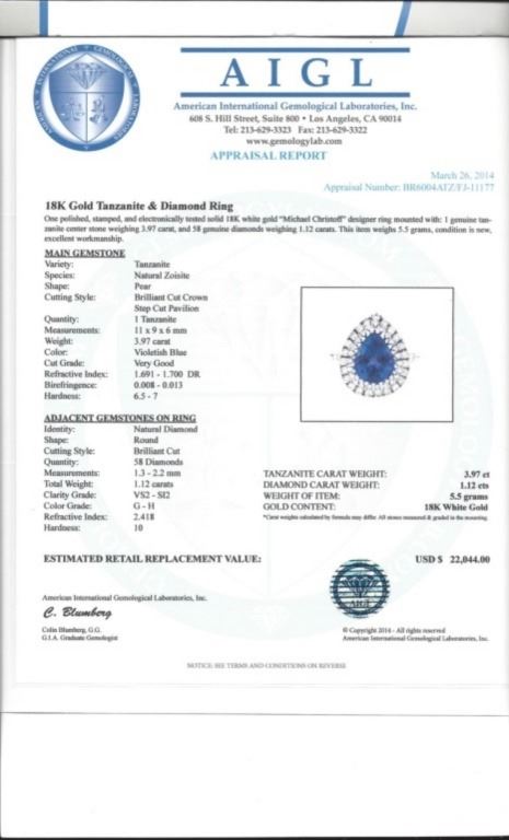 Regarding Appraised Jewelry and Loose Stones - Auctionfarm sends them out to a third party for Retail Replacement Value Appraisals, which are the most common. These types of evaluations are written for insurance needs. This would be the cost to replace the jewelry with an item of equal quality and kind, considered to be the current market price or the replacement value. This type of appraisal is done to protect you in the event of damage or loss of a valuable item. Our appraisals are conducted by independent 3rd Party appraisal firms that utilizes Certified GIA Gemologist. Appraisals should be used for verification of gemstone and/or metal weight, size, and grade only, not actual value. Appraisal value should be considered for insurance purposes only, not actual value, as price varies greatly from retail locations thru out the world. Items should not be purchased with the expectation to resell for appraisal price, or for profit.