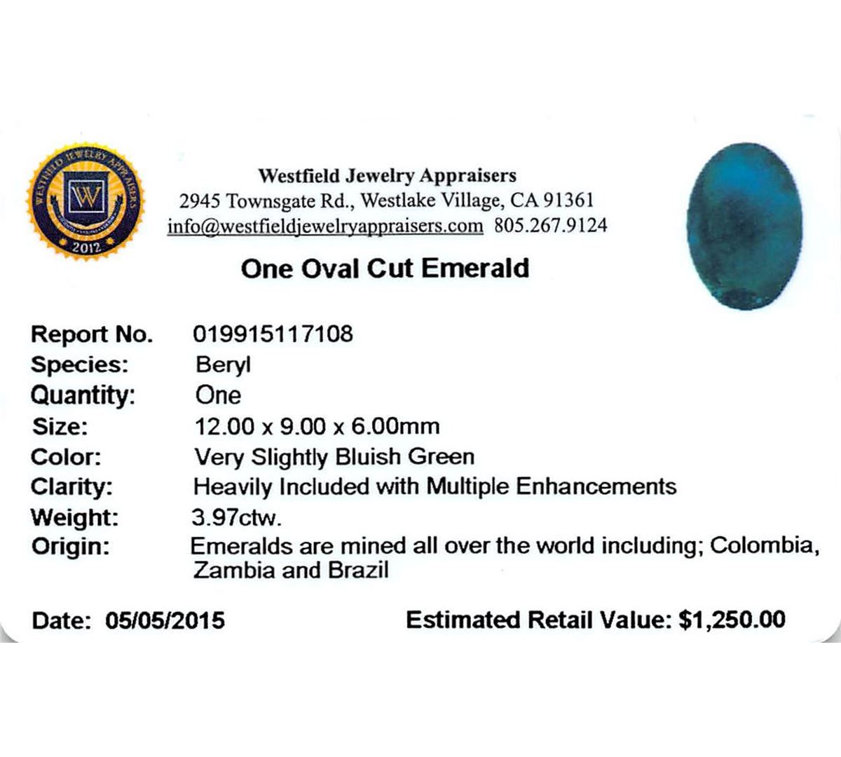 One oval mixed cut natural emerald, measuring 12.00 x 9.00 x 6.00mm, exact weight 3.97ct., clarity is heavily included, type III, medium dark, very slightly grayish, very slightly bluish green color, (GIA vslbG 6/3), cut is good. Westfield Appraised at $1,250.00.