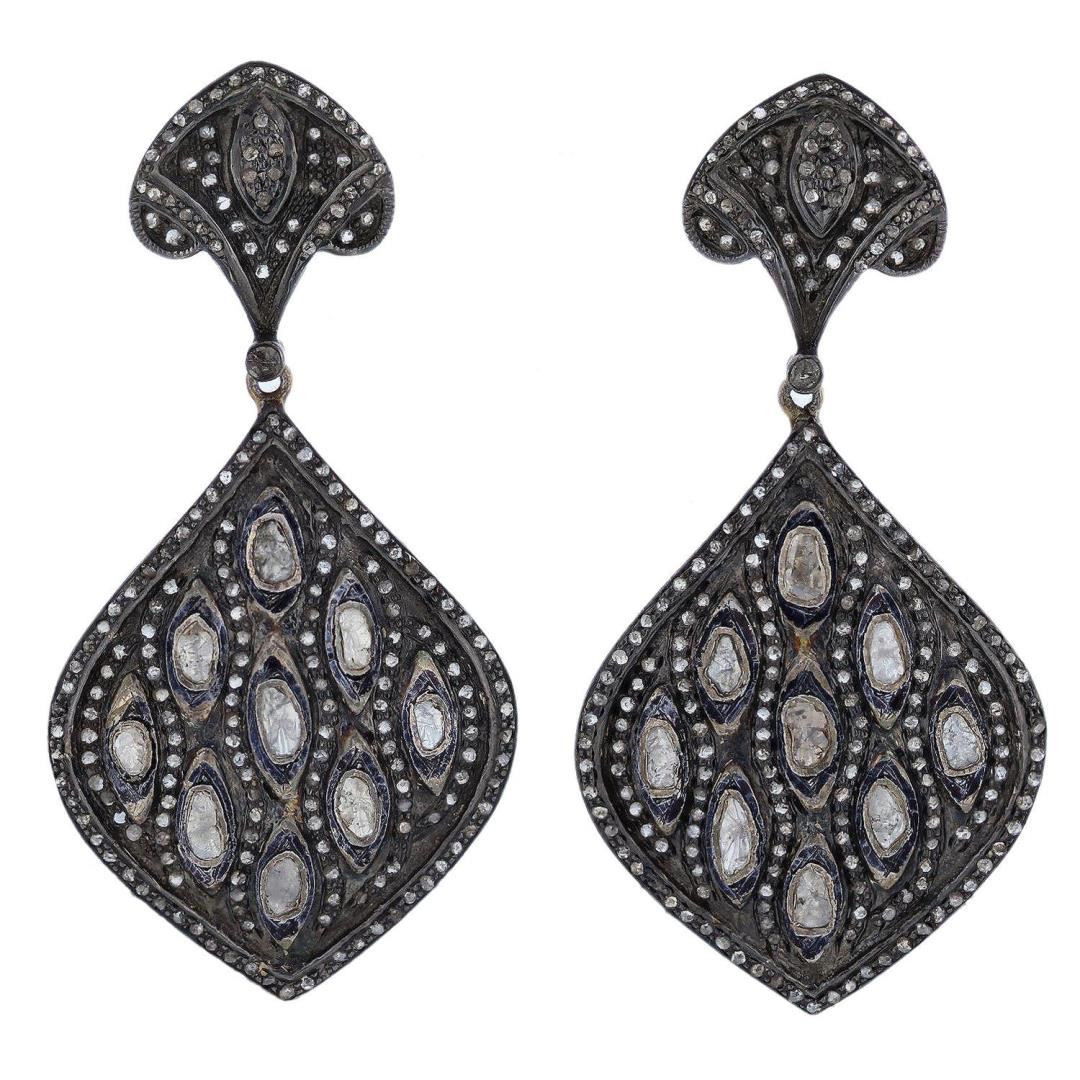925 silver ladies cast & assembled diamond dangle earrings. Condition is new, good workmanship. Eighteen bezel set tablet cut diamonds, measuring 4.00 x 2.50 x 0.70mm (depth est.) approximate total weight of 18 Stones = 0.88ct. Measurements are an averag