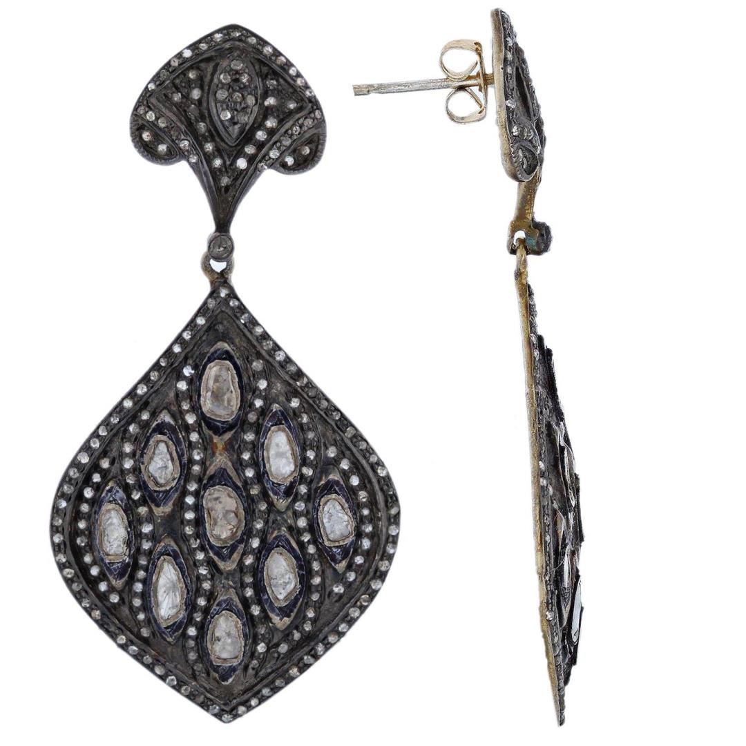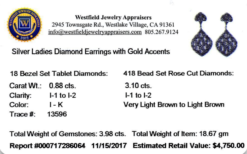 925 silver ladies cast & assembled diamond dangle earrings. Condition is new, good workmanship. Eighteen bezel set tablet cut diamonds, measuring 4.00 x 2.50 x 0.70mm (depth est.) approximate total weight of 18 Stones = 0.88ct. Measurements are an average for the group, Graded in the setting.Each tablet diamond is bezel set and fitted over foil backs.This was a popular method of illusion setting in the seventeenth and eighteenth centuries. The final appearance of the diamond is that of a much larger stone, an illusion. Clarity I-1 to I-2 Color I - K Four Hundred Eighteen bead & bezel set rose cut diamonds, measuring 2.00 - 1.00 x 0.70mm (depth est.) approximate total weight of 418 Stones = 3.10ct. The group contains a mix of natural Very Light Brown & Light Brown color diamonds., Graded in the setting. Clarity I-1 to I-3 Total Weight of Diamonds 3.98 ct. Total Weight of Dangle Earrings 18.67 gm