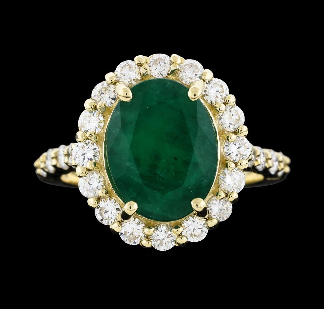 One electronically tested 14KT yellow gold lady's cast fashion ring with a cathedral shank with a halo with a bright polish finish. The featured lady's ring has a shank measuring 2.10 millimeters wide. Identified with markings of '14K'. Condition is new, good workmanship. Containing: One prong set oval modified mixed cut natural emerald, measuring 11.65 x 9.00 x 5.90mm, (depth est.) 10%. bulge factor, approximate weight of 3.98ct., clarity is heavily included, medium dark, moderately strong, green color, (GIA G 6/4), cut is good. Transmitting light somewhat diffusely, transparent to translucent. Indications of oil residue. Naturally occurring internal & external characteristics are present. Colored gemstones are presumed to have been subjected to commonly used enhancement processes. Graded in the setting. Sixteen prong set round brilliant cut diamonds, measuring 2.30 - 2.20 x 1.35mm (depth est.) approximate total weight of 16 Stones = 0.67ct. Graded in the setting. Clarity SI-1 to I-1. Color: H - I Cut Good Twelve prong set round brilliant cut diamonds, measuring 2.10 - 2.00 x 1.23mm (depth est.) approximate total weight of 12 Stones = 0.38ct. Graded in the setting. Clarity SI-1 to SI-3. Color: H - I Cut Good. Total Weight of Colored Stones 3.98ct.. Total Weight of Diamonds 1.05ct.. Total Weight of Ring 5.50gm. GAS Appraised at $6,855.00.