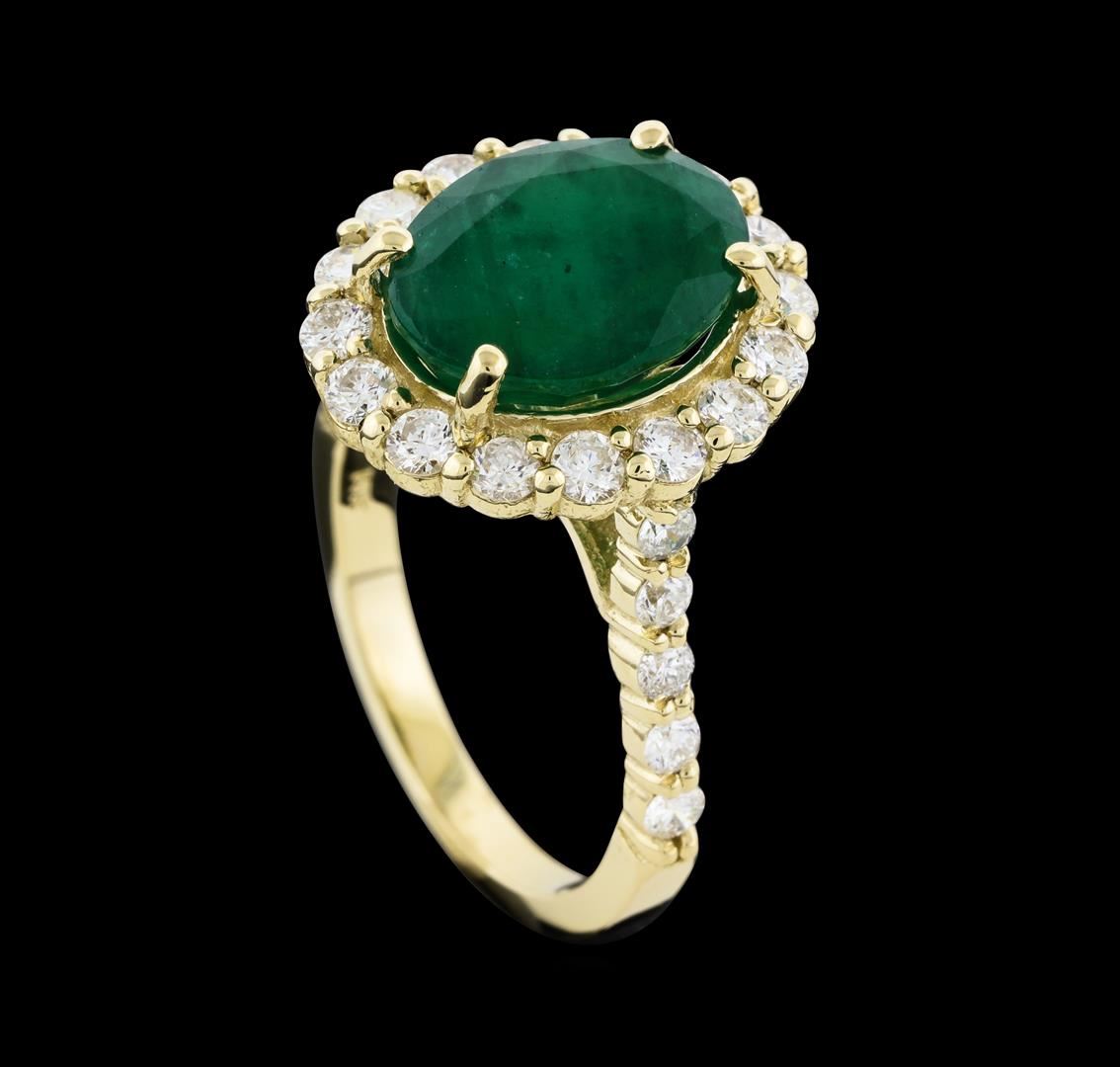 One electronically tested 14KT yellow gold lady's cast fashion ring with a cathedral shank with a halo with a bright polish finish. The featured lady's ring has a shank measuring 2.10 millimeters wide. Identified with markings of '14K'. Condition is new, good workmanship. Containing: One prong set oval modified mixed cut natural emerald, measuring 11.65 x 9.00 x 5.90mm, (depth est.) 10%. bulge factor, approximate weight of 3.98ct., clarity is heavily included, medium dark, moderately strong, green color, (GIA G 6/4), cut is good. Transmitting light somewhat diffusely, transparent to translucent. Indications of oil residue. Naturally occurring internal & external characteristics are present. Colored gemstones are presumed to have been subjected to commonly used enhancement processes. Graded in the setting. Sixteen prong set round brilliant cut diamonds, measuring 2.30 - 2.20 x 1.35mm (depth est.) approximate total weight of 16 Stones = 0.67ct. Graded in the setting. Clarity SI-1 to I-1. Color: H - I Cut Good Twelve prong set round brilliant cut diamonds, measuring 2.10 - 2.00 x 1.23mm (depth est.) approximate total weight of 12 Stones = 0.38ct. Graded in the setting. Clarity SI-1 to SI-3. Color: H - I Cut Good. Total Weight of Colored Stones 3.98ct.. Total Weight of Diamonds 1.05ct.. Total Weight of Ring 5.50gm. GAS Appraised at $6,855.00.