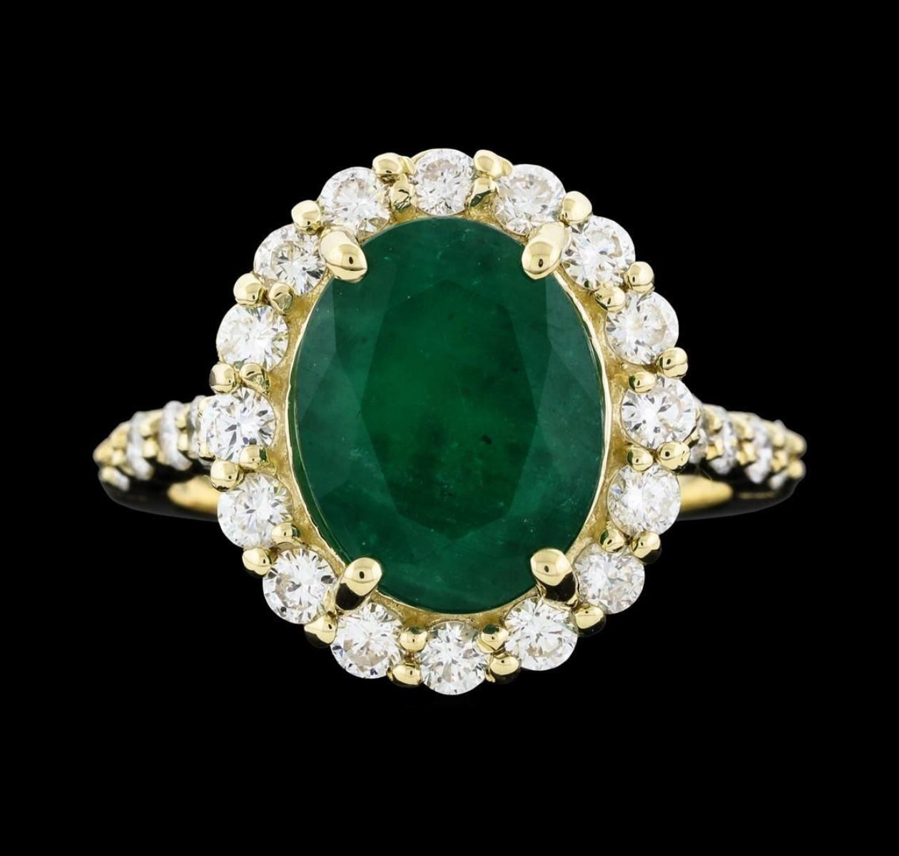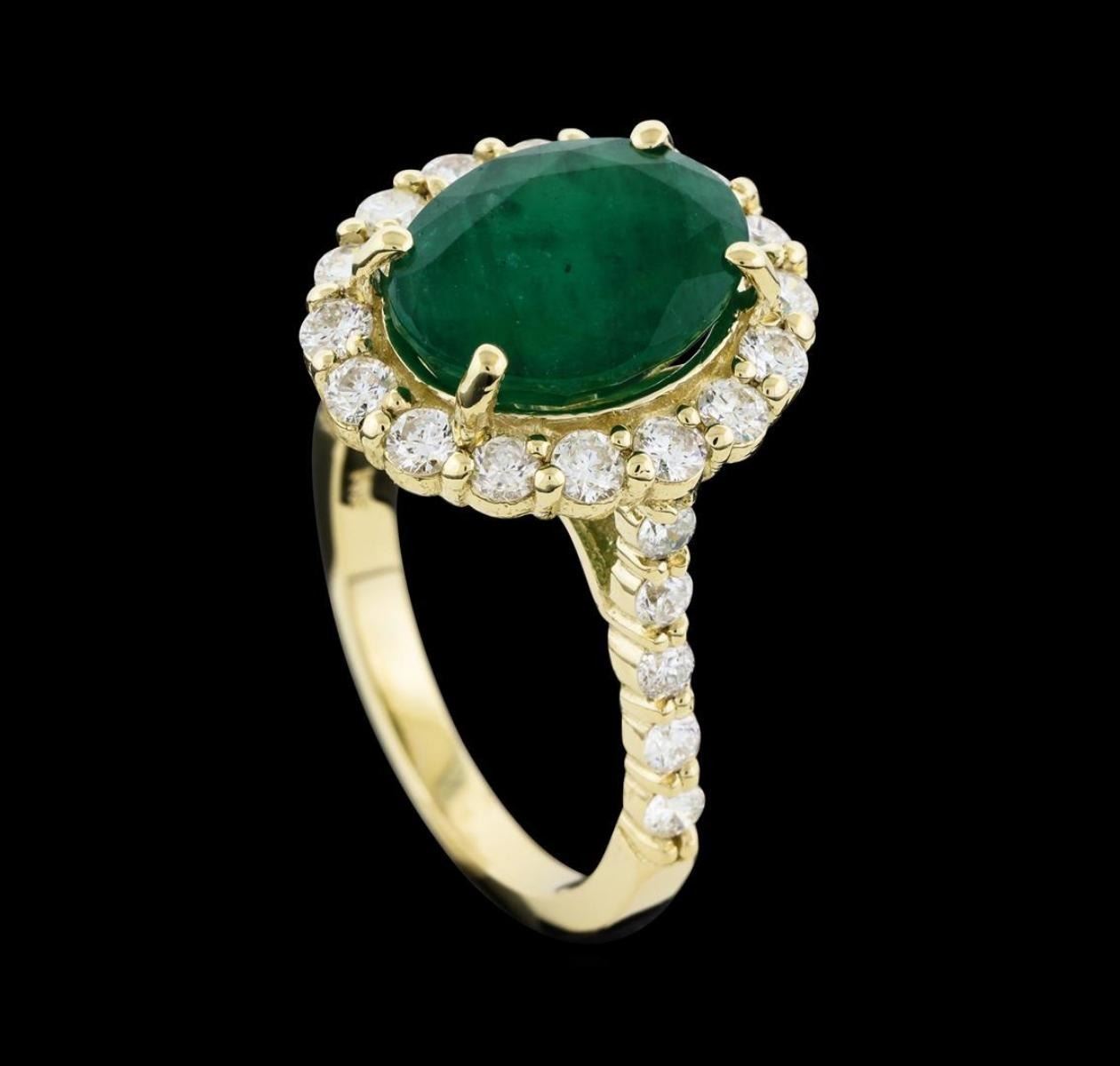 One electronically tested 14KT yellow gold lady's cast fashion ring with a cathedral shank with a halo with a bright polish finish. The featured lady's ring has a shank measuring 2.10 millimeters wide. Identified with markings of '14K'. Condition is new, good workmanship. Containing: One prong set oval modified mixed cut natural emerald, measuring 11.65 x 9.00 x 5.90mm, (depth est.) 10%. bulge factor, approximate weight of 3.98ct., clarity is heavily included, medium dark, moderately strong, green color, (GIA G 6/4), cut is good. Transmitting light somewhat diffusely, transparent to translucent. Indications of oil residue. Naturally occurring internal & external characteristics are present. Colored gemstones are presumed to have been subjected to commonly used enhancement processes. Graded in the setting. Sixteen prong set round brilliant cut diamonds, measuring 2.30 - 2.20 x 1.35mm (depth est.) approximate total weight of 16 Stones = 0.67ct. Graded in the setting. Clarity SI-1 to I-1. Color: H - I Cut Good Twelve prong set round brilliant cut diamonds, measuring 2.10 - 2.00 x 1.23mm (depth est.) approximate total weight of 12 Stones = 0.38ct. Graded in the setting. Clarity SI-1 to SI-3. Color: H - I Cut Good. Total Weight of Colored Stones 3.98ct.. Total Weight of Diamonds 1.05ct.. Total Weight of Ring 5.50gm. GAS Appraised.