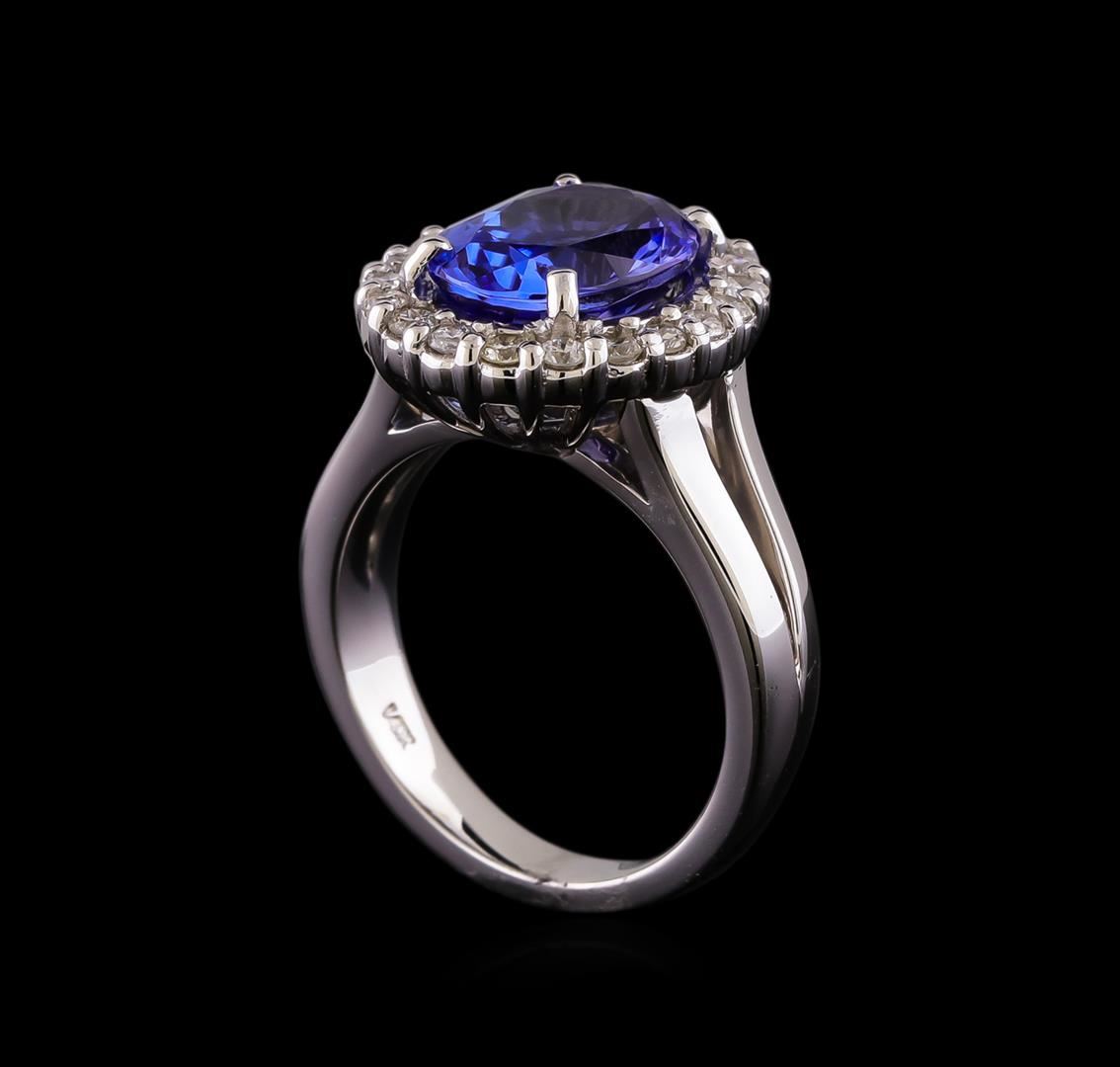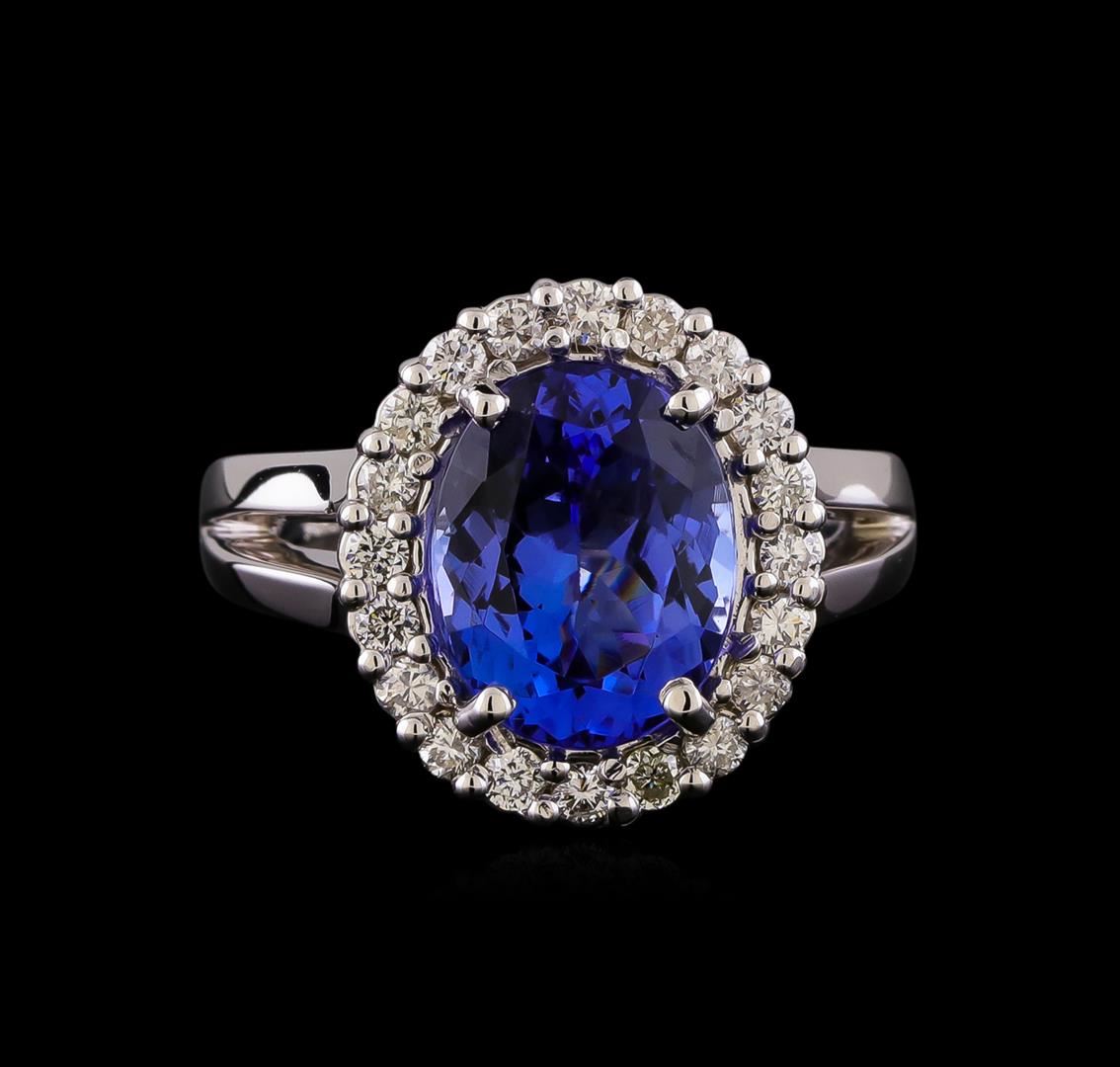 One electronically tested 14KT white gold lady's cast fashion ring with a split shank basket halo with a bright polish finish. The featured lady's ring has a shank measuring 3.15 millimeters wide. Identified with markings of "14K". Condition is new, good workmanship. Containing: One prong set oval modified brilliant cut natural tanzanite, measuring 11.16 x 8.73 x 5.67mm, (depth est.) approximate weight of 3.98ct., clarity is eye clean, medium dark, moderately strong, bluish violet color, (GIA bV 6/4), cut is very good. Transmitting light with no distortion, transparent. Colored gemstones are presumed to have been subjected to commonly used enhancement processes. Graded in the setting. Twenty prong set round brilliant cut diamonds, measuring 1.95 - 1.85 x 1.18mm (depth est.) approximate total weight of 20 Stones = 0.52ct. Graded in the setting. Clarity: VS-2 to SI-2. Color: H - I. Cut Good. Total Weight of Colored Stones 3.98ct. Total Weight of Diamonds 0.52ct. Total Weight of Ring 9.00gm. GAS Appraised at $9,460.00.