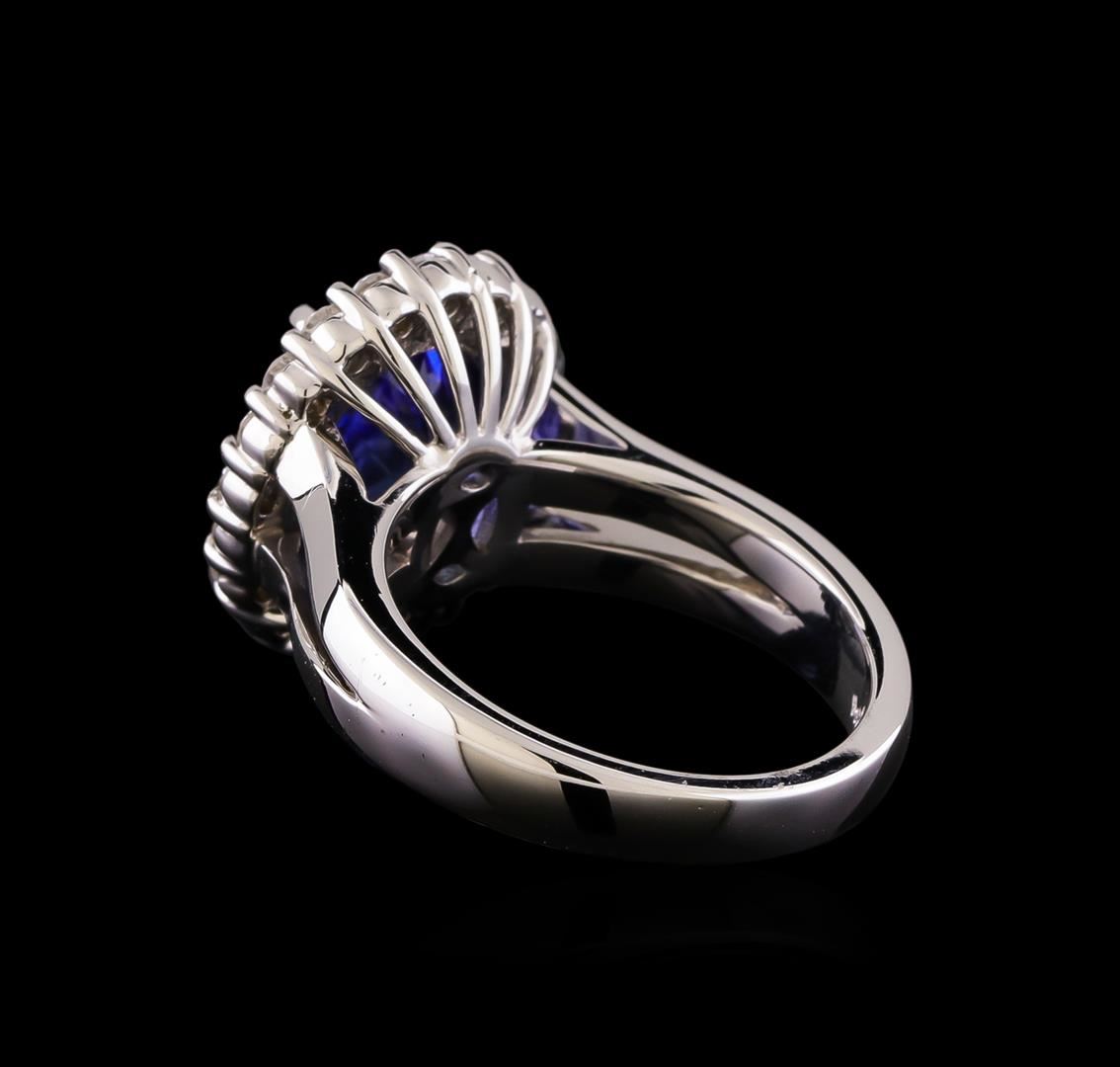 One electronically tested 14KT white gold lady's cast fashion ring with a split shank basket halo with a bright polish finish. The featured lady's ring has a shank measuring 3.15 millimeters wide. Identified with markings of "14K". Condition is new, good workmanship. Containing: One prong set oval modified brilliant cut natural tanzanite, measuring 11.16 x 8.73 x 5.67mm, (depth est.) approximate weight of 3.98ct., clarity is eye clean, medium dark, moderately strong, bluish violet color, (GIA bV 6/4), cut is very good. Transmitting light with no distortion, transparent. Colored gemstones are presumed to have been subjected to commonly used enhancement processes. Graded in the setting. Twenty prong set round brilliant cut diamonds, measuring 1.95 - 1.85 x 1.18mm (depth est.) approximate total weight of 20 Stones = 0.52ct. Graded in the setting. Clarity: VS-2 to SI-2. Color: H - I. Cut Good. Total Weight of Colored Stones 3.98ct. Total Weight of Diamonds 0.52ct. Total Weight of Ring 9.00gm. GAS Appraised at $9,460.00.