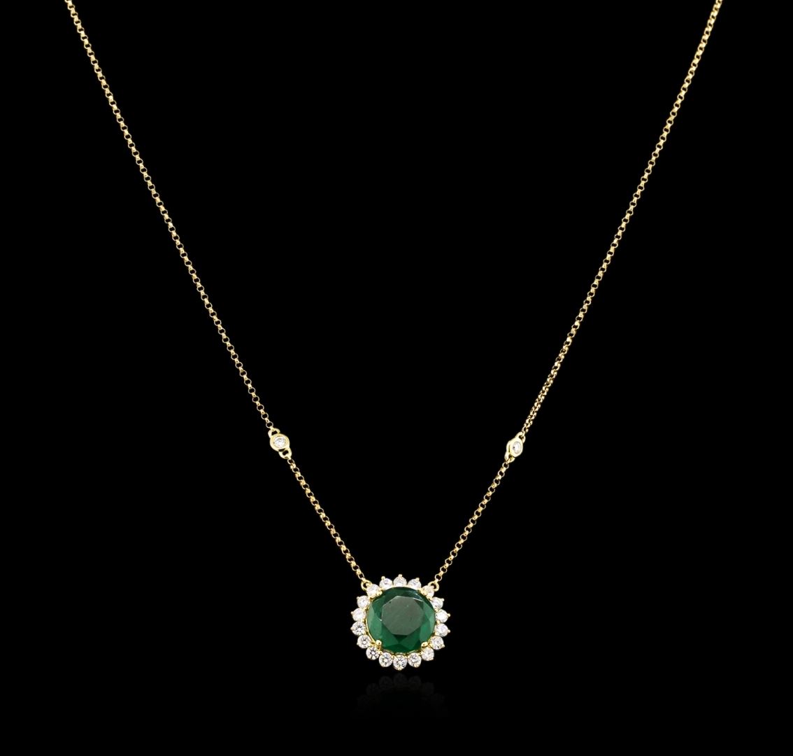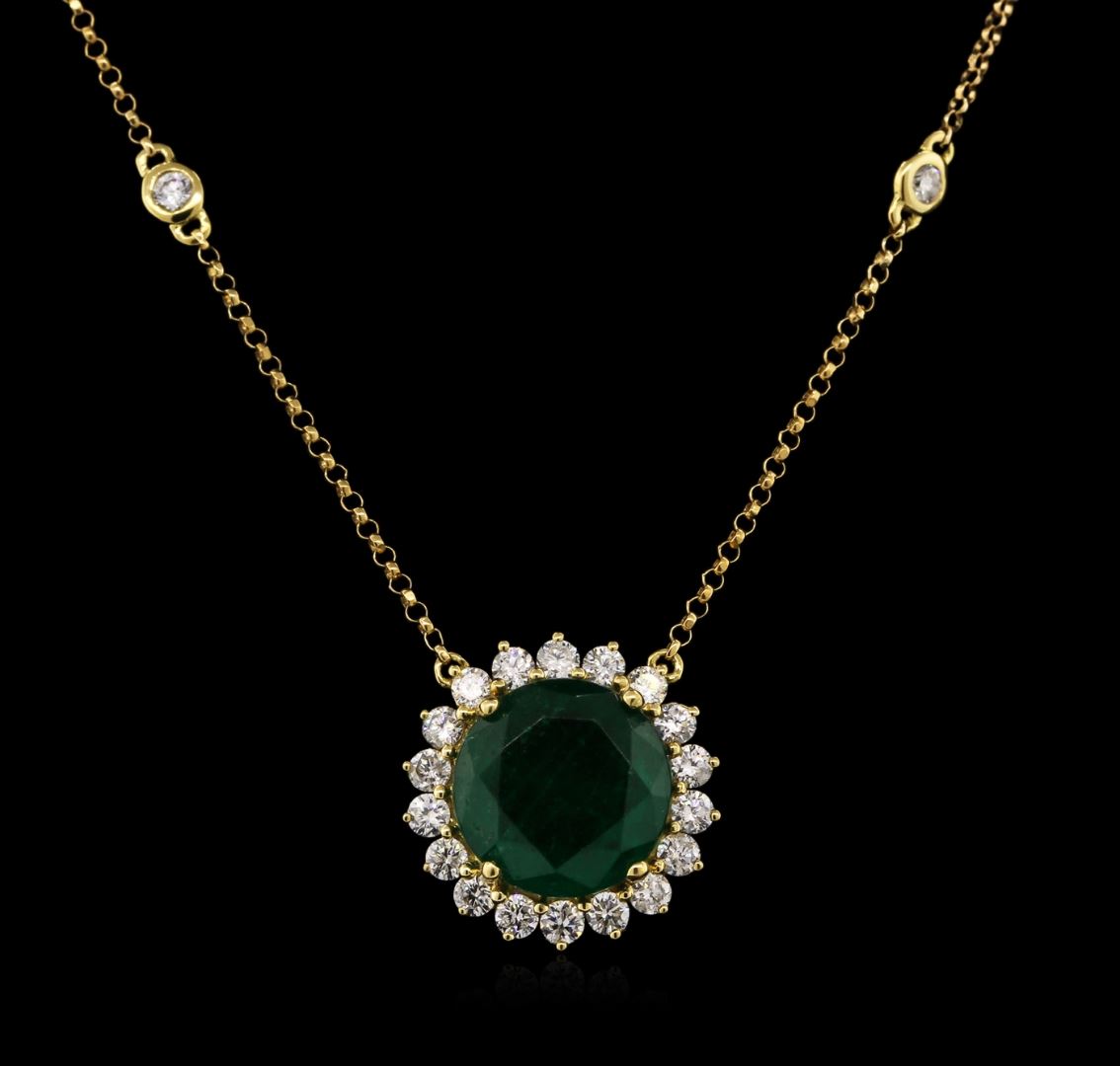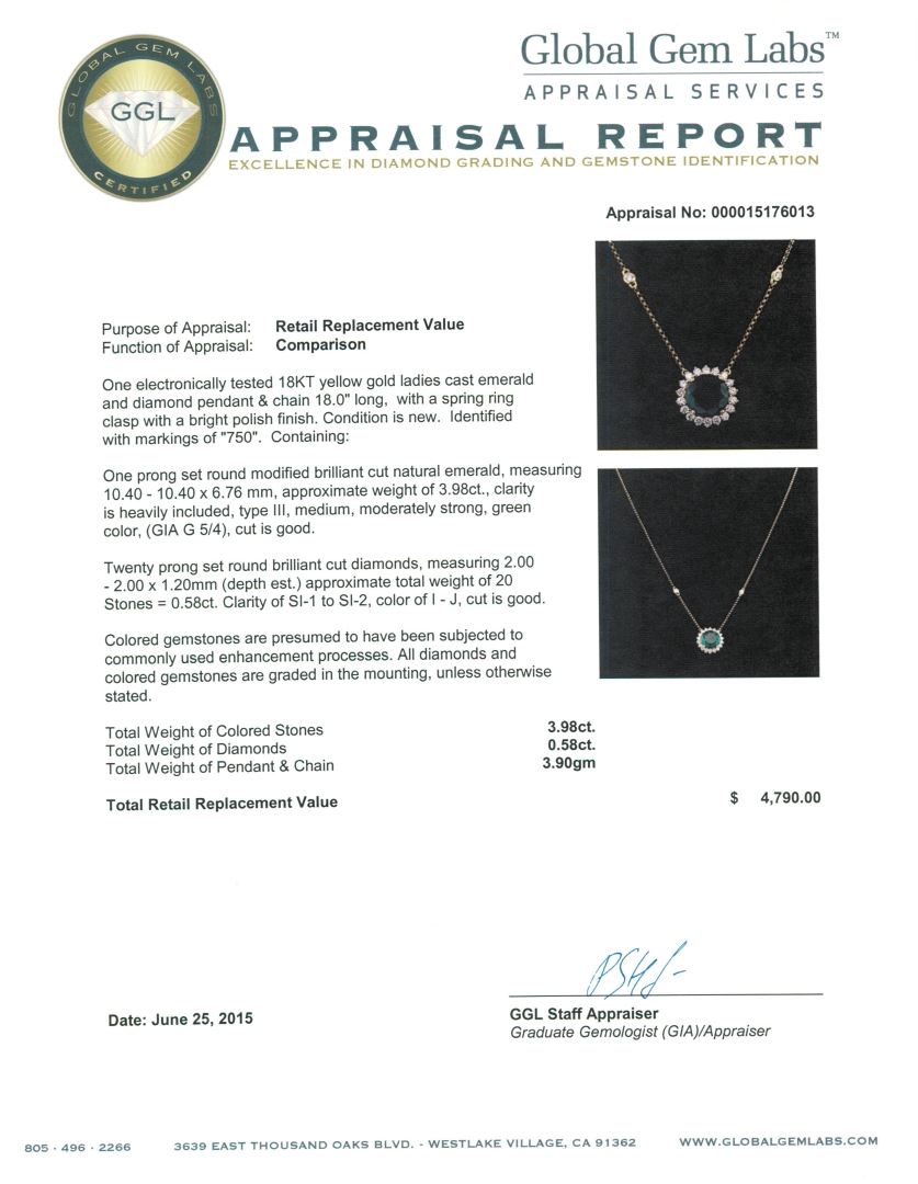 One electronically tested 18KT yellow gold ladies cast emerald and diamond pendant & chain 18.0" long, with a spring ring clasp with a bright polish finish. Identified with markings of "750". Condition is new. Containing: One prong set round modified brilliant cut natural emerald, measuring 10.40 - 10.40 x 6.76 mm, approximate weight of 3.98ct., clarity is heavily included, type III, medium, moderately strong, green color, (GIA G 5/4), cut is good. Twenty prong set round brilliant cut diamonds, measuring 2.00 - 2.00 x 1.20mm (depth est.) approximate total weight of 20 Stones = 0.58ct. Clarity: SI-1 to SI-2. Color: I - J, Cut is Good. Colored gemstones are presumed to have been subjected to commonly used enhancement processes. All diamonds and colored gemstones are graded in the mounting, unless otherwise stated. Total Weight of Colored Stones 3.98ct. Total Weight of Diamonds 0.58ct. Total Weight of Pendant & Chain 3.90 grams. GGL Appraised at $4,790.00.