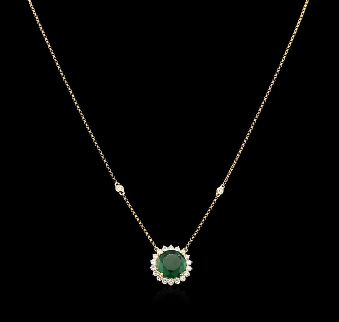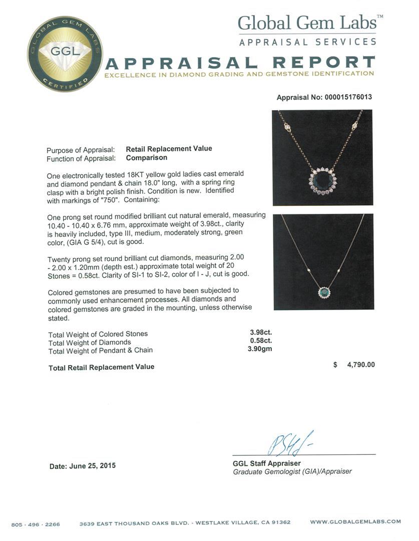 One electronically tested 18KT yellow gold ladies cast emerald and diamond pendant & chain 18.0" long, with a spring ring clasp with a bright polish finish. Identified with markings of "750". Condition is new. Containing: One prong set round modified brilliant cut natural emerald, measuring 10.40 - 10.40 x 6.76 mm, approximate weight of 3.98ct., clarity is heavily included, type III, medium, moderately strong, green color, (GIA G 5/4), cut is good. Twenty prong set round brilliant cut diamonds, measuring 2.00 - 2.00 x 1.20mm (depth est.) approximate total weight of 20 Stones = 0.58ct. Clarity: SI-1 to SI-2. Color: I - J, Cut is Good. Colored gemstones are presumed to have been subjected to commonly used enhancement processes. All diamonds and colored gemstones are graded in the mounting, unless otherwise stated. Total Weight of Colored Stones 3.98ct. Total Weight of Diamonds 0.58ct. Total Weight of Pendant & Chain 3.90 grams. GGL Appraised at $4,790.00.