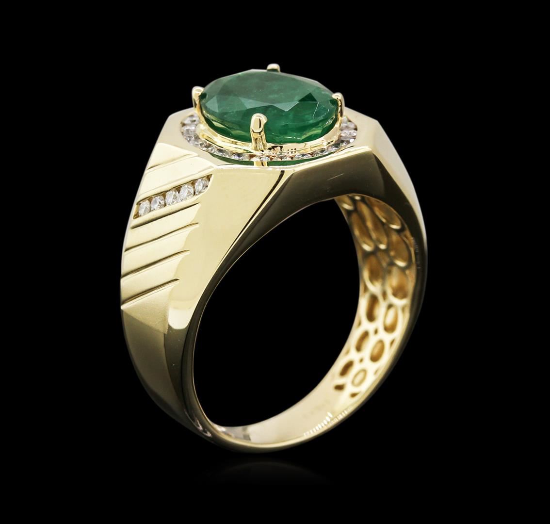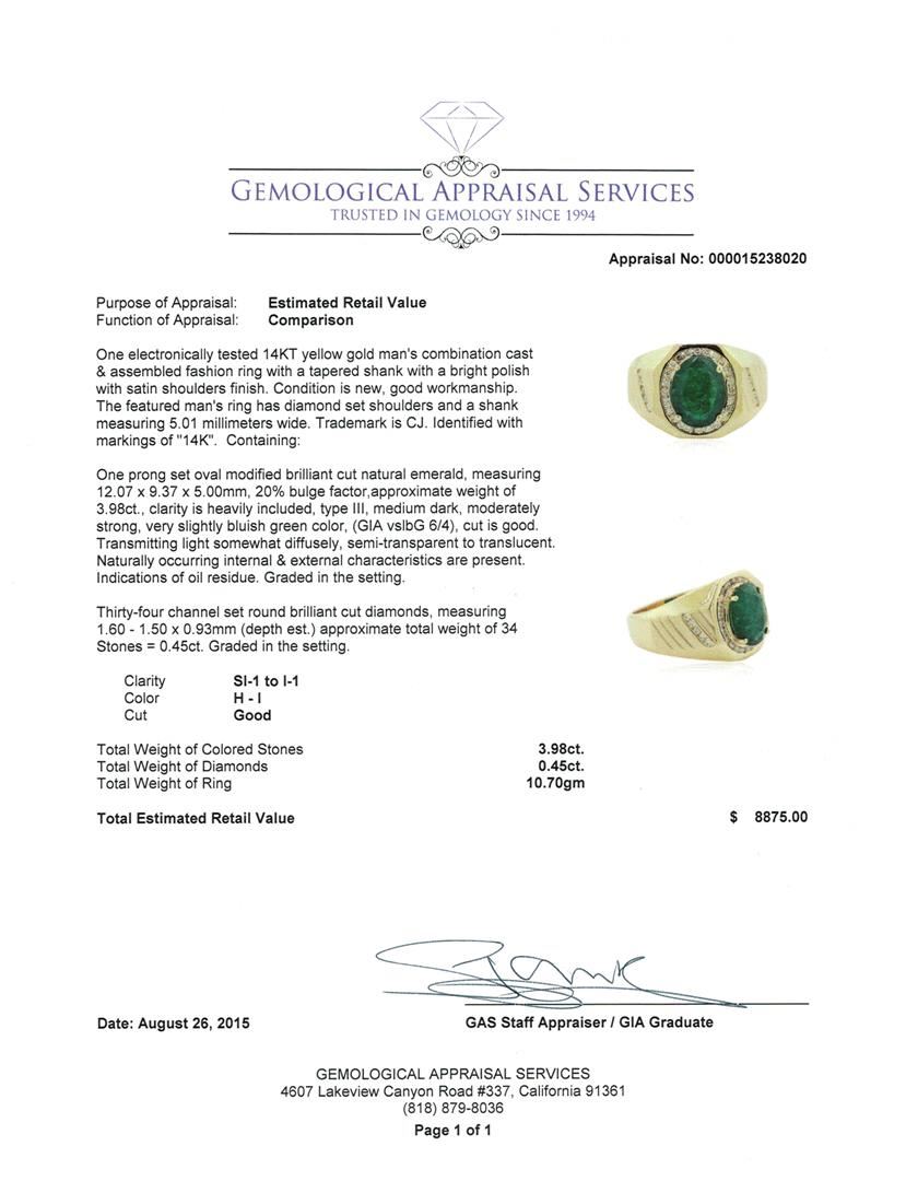One electronically tested 14KT yellow gold man's combination cast & assembled fashion ring with a tapered shank with a bright polish with satin shoulders finish. The featured man's ring has diamond set shoulders and a shank measuring 5.01 millimeters wide. Trademark is CJ. Identified with markings of "14K". Condition is new, good workmanship. Containing: One prong set oval modified brilliant cut natural emerald, measuring 12.07 x 9.37 x 5.00mm, 20% bulge factor, approximate weight of 3.98ct., clarity is heavily included, type III, medium dark, moderately strong, very slightly bluish green color, (GIA vslbG 6/4), cut is good. Transmitting light somewhat diffusely, semi-transparent to translucent. Naturally occurring internal & external characteristics are present. Indications of oil residue. Graded in the setting. Thirty-Four channel set round brilliant cut diamonds, measuring 1.60 - 1.50 x 0.93mm (depth est.) approximate total weight of 34 Stones = 0.45ct. Graded in the setting. Clarity: SI-1 to I-1. Color: H - I. Cut Good. Total Weight of Colored Stones 3.98ct. Total Weight of Diamonds 0.45ct. Total Weight of Ring 10.70gm. GAS Appraised at $8,875.00.