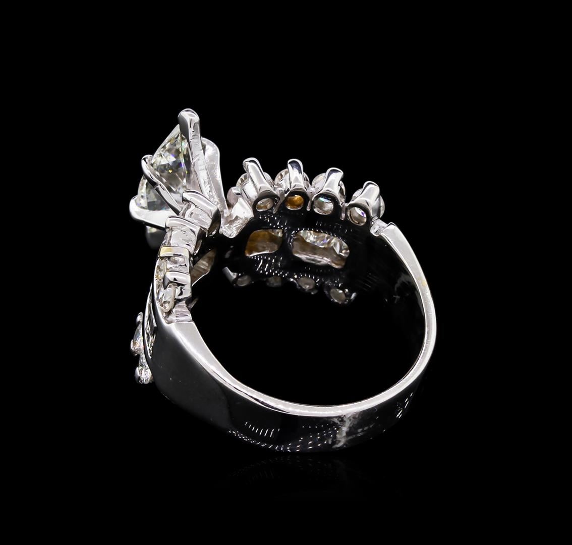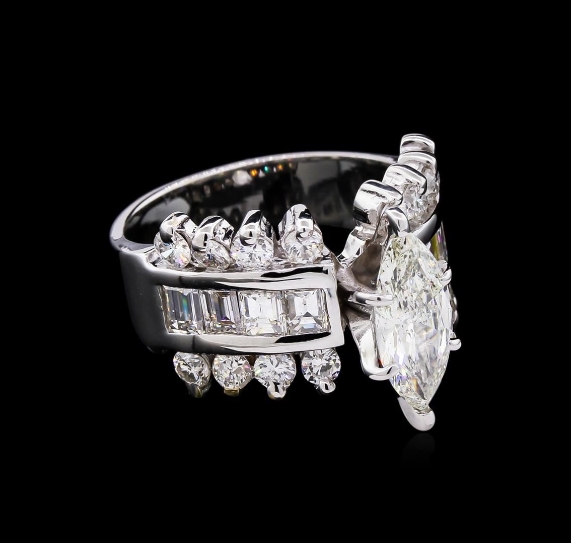 One electronically tested 14KT white gold lady's cast wedding ring with a tapered shank with a bright polish finish. The featured lady's ring has a shank measuring 4.90 millimeters wide. Condition is used, good workmanship. Containing: One prong set marquise shaped cut diamond, measuring 12.45 x 5.57 x 3.20mm (depth est.) approximate weight of 1.29ct. Graded in the setting. Clarity: SI-2. Color: J. Cut Very Good Eight channel set baguette cut diamonds, measuring from 3.30 x 2.80 x 1.70mm (depth est.) to 3.60 x 3.19 x 2.10mm (depth est.) approximate total weight of 8 Stones = 1.49ct. Graded in the setting. Clarity: VS-1 to SI-1. Color: H - I. Cut Very Good Sixteen prong set round brilliant cut diamonds, measuring 2.80 - 2.60 x 1.70mm (depth est.) approximate total weight of 16 Stones = 1.21ct. Graded in the setting. Clarity: VS-2 to SI-2. Color: H - I. Cut Good. Total Weight of Diamonds 3.99ct. Total Weight of Ring 9.80gm. GAS Appraised at $18,515.00.