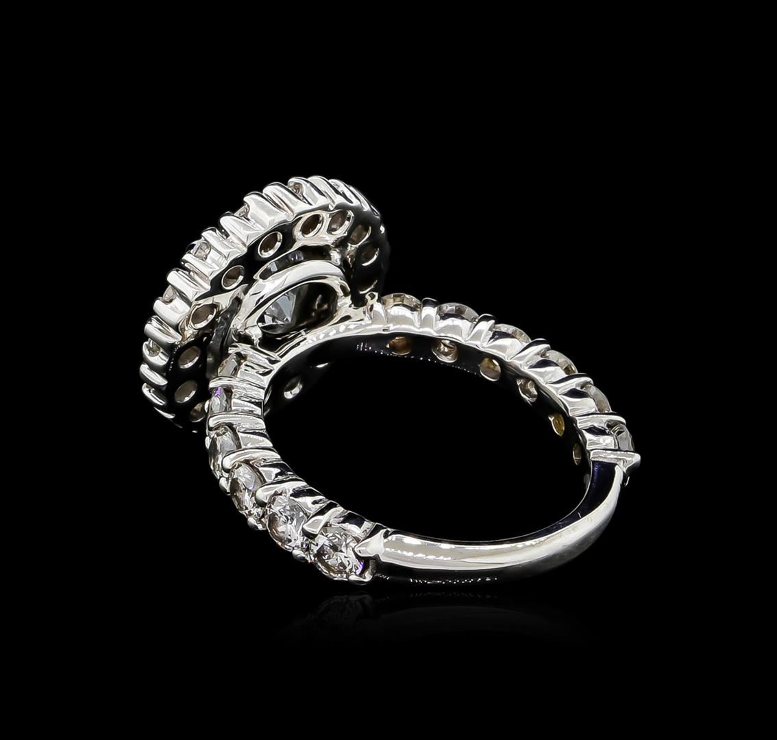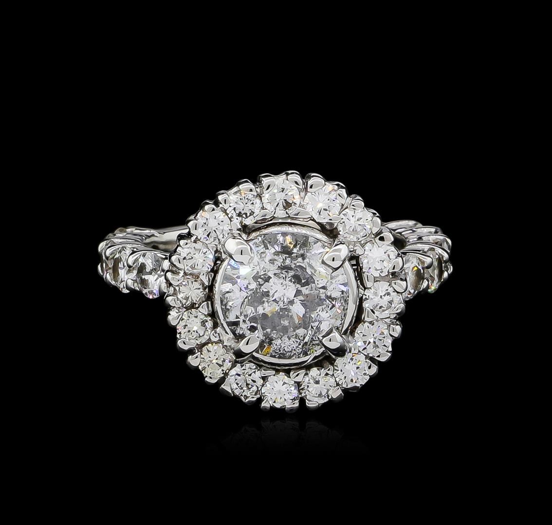 One electronically tested 18KT white gold ladies cast diamond unity ring with a bright polish finish. The featured diamond is set within a diamond bezel supported by diamond set shoulders, completed by a two millimeter wide band. Identified with markings of "18K". Condition is good. Containing: One prong set round brilliant cut diamond, measuring 7.90 - 7.90 x 4.74mm (depth est.), 3.00.%. GTCF approximate weight of 1.86ct. Graded in the setting. Clarity: I-1. Color: H. Depth 60.0%. Table 57.0%. Twelve prong set round brilliant cut diamonds, measuring 3.10 - 2.95 x 1.82mm (depth est.) approximate total weight of 12 Stones = 1.23ct. Graded in the setting. Clarity: SI-1 to SI-2. Color: H - I Sixteen prong set round brilliant cut diamonds, measuring 2.50 - 2.40 x 1.47mm (depth est.) approximate total weight of 16 Stones = 0.90ct. Graded in the setting. Clarity: VS-2 to SI-2. Color: H - I. Total Weight of Diamonds 3.99ct. Total Weight of Ring 7.01gm. AIG Appraised at $28,040.00.