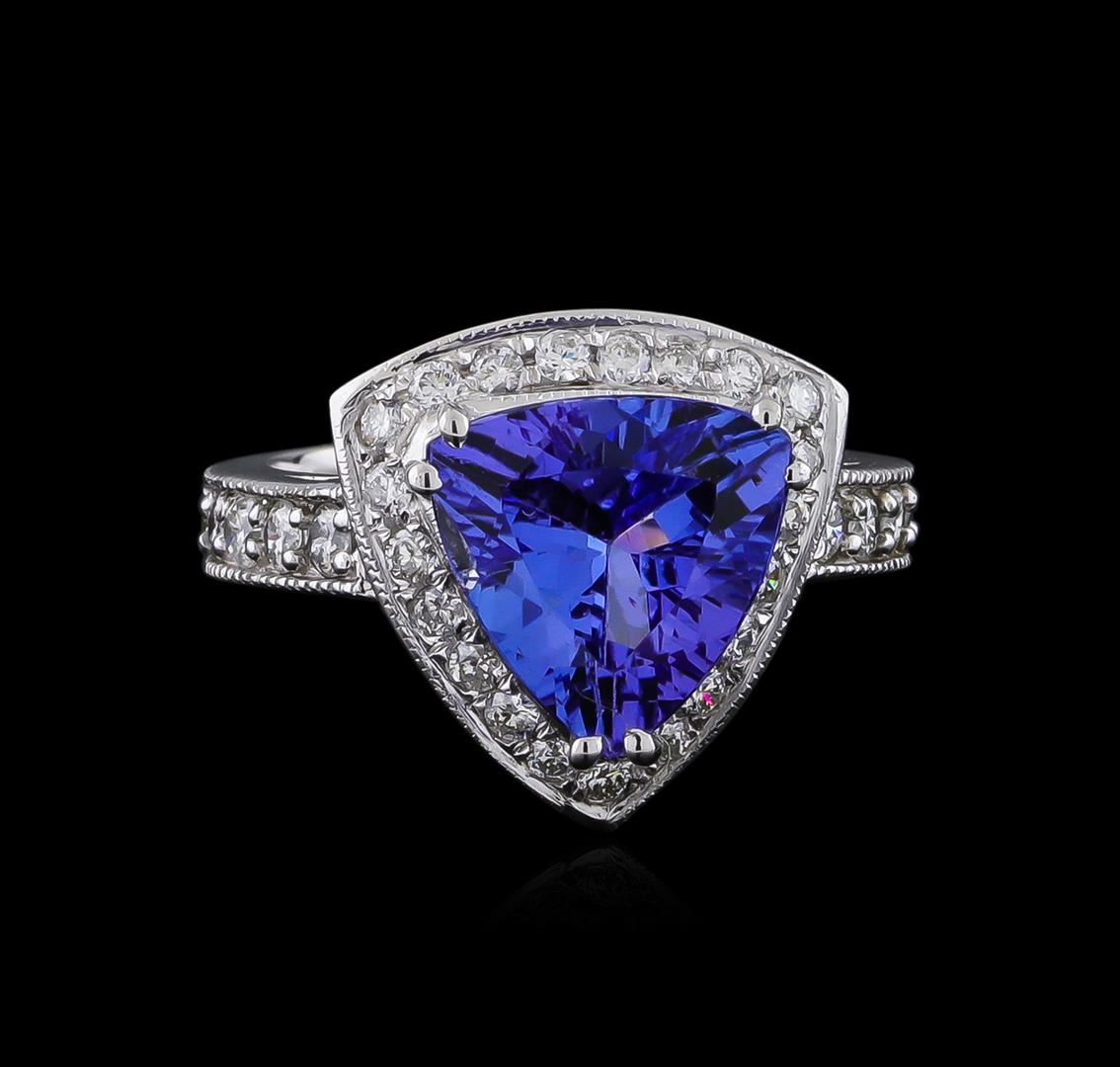 One electronically tested 14KT white gold lady's cast fashion ring with a cathedral halo with a bright polish with milgrain detailing finish. The featured lady's ring has a shank measuring 2.97 millimeters wide. Identified with markings of "K14". Condition is new, good workmanship. Containing: One prong set triangle modified brilliant cut natural tanzanite, measuring 11.06 x 10.95 x 5.64mm, approximate weight of 3.99ct., clarity is eye clean, type I, medium, very slightly grayish, violetish blue color, (GIA vB 5/3), cut is very good. Transmitting light with no distortion, transparent. Colored gemstones are presumed to have been subjected to commonly used enhancement processes. Graded in the setting. Ten prong set round brilliant cut diamonds, measuring 2.40 - 2.30 x 1.41mm (depth est.) approximate total weight of 10 Stones = 0.47ct. Graded in the setting. Clarity: SI-1 to SI-2. Color: G - I. Cut Good Twenty-One prong set round brilliant cut diamonds, measuring 1.70 - 1.60 x 1.02mm (depth est.) approximate total weight of 21 Stones = 0.35ct. Graded in the setting. Clarity: SI-1 to I-1. Color: G - I. Cut Good. Total Weight of Colored Stones 3.99ct. Total Weight of Diamonds 0.82ct. Total Weight of Ring 7.10gm. GAS Appraised at $9,195.00.