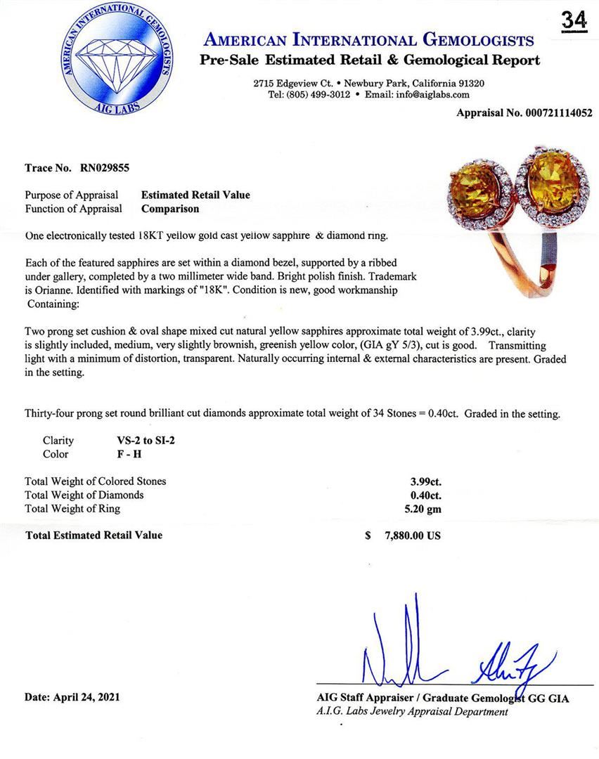 One electronically tested 18KT yellow gold cast yellow sapphire & diamond ring. Each of the featured sapphires are set within a diamond bezel, supported by a ribbed under gallery, completed by a two millimeter wide band. Bright polish finish. Trademark