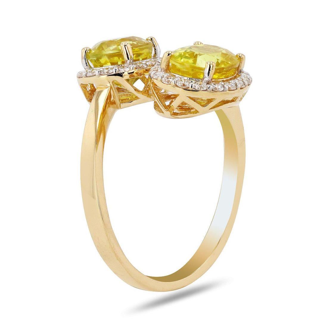 One electronically tested 18KT yellow gold cast yellow sapphire & diamond ring. Each of the featured sapphires are set within a diamond bezel, supported by a ribbed under gallery, completed by a two millimeter wide band. Bright polish finish. Trademark is Orianne. Identified with markings of "18K". Condition is new, good workmanship Containing: Two prong set cushion & oval shape mixed cut natural yellow sapphires approximate total weight of 3.99ctw., clarity is slightly included, medium, very slightly brownish, greenish yellow color, (GIA gY 5/3), cut is good. Transmitting light with a minimum of distortion, transparent. Naturally occurring internal & external characteristics are present. Graded in the setting. Thirty-four prong set round brilliant cut diamonds approximate total weight of 34 Stones = 0.40ctw. Graded in the setting. Clarity VS2 to SI2 Color F - H Total Weight of Colored Stones 3.99ctw. Total Weight of Diamonds 0.40ctw. Total Weight of Ring 5.20 gm Size: 6 3/4