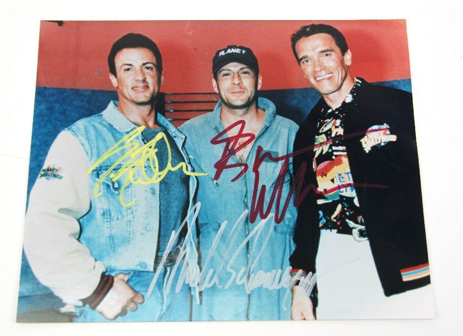 Autographed photograph of action movie actors Sylvester Stallone, Bruce Willis, and Arnold Schwarzenegger. COA from Showcases USA on back. Photo measures 9 3/4 by 8 inches. Very good condition.
