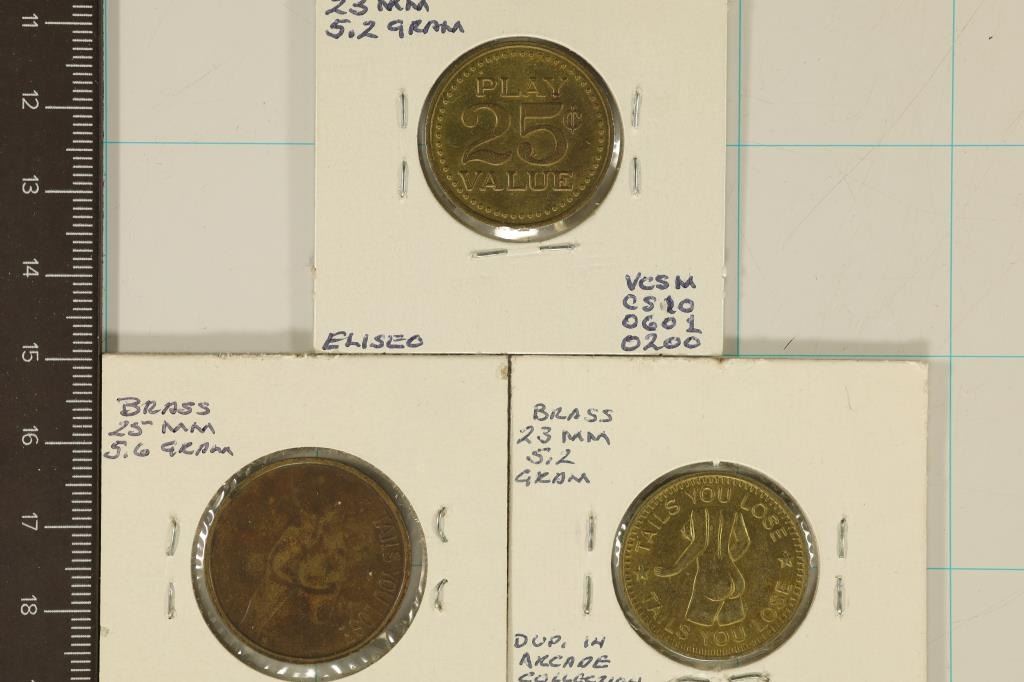 25 CENT PLAY ARCADE TOKEN AND 2 FLIPPER TOKENS "HEADS I WIN" ON THE OBVERSE AND "TAILS YOU LOSE" ON THE REVERSE.