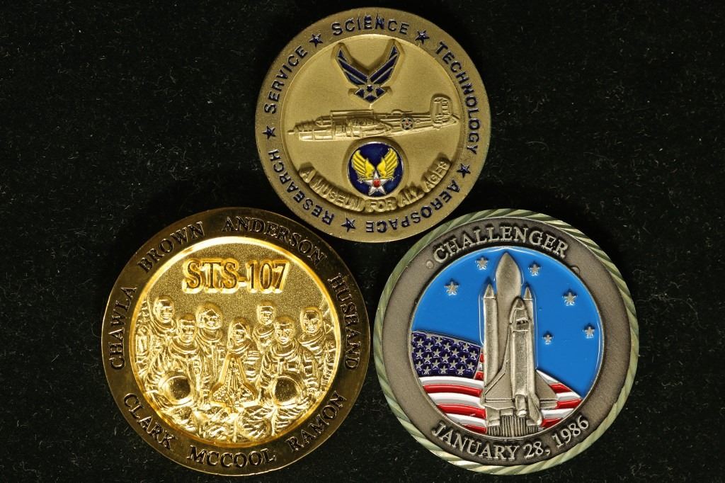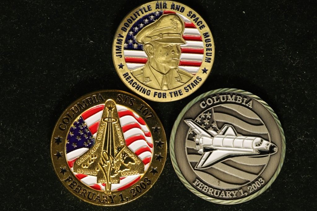 COLUMBIA STS 107 FEB. 1ST, 2003, 1.75" CHALLENGER JANUARY 28TH, 1986-COLUMBIA FEB. 1ST, 2003 AND 1.5" JIMMY DOOLITTLE AIR AND SPACE MUSEUM "REACHING FOR THE STARS"
