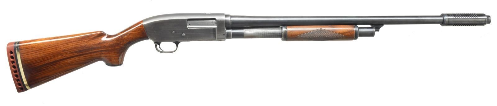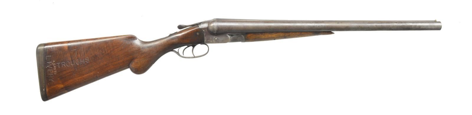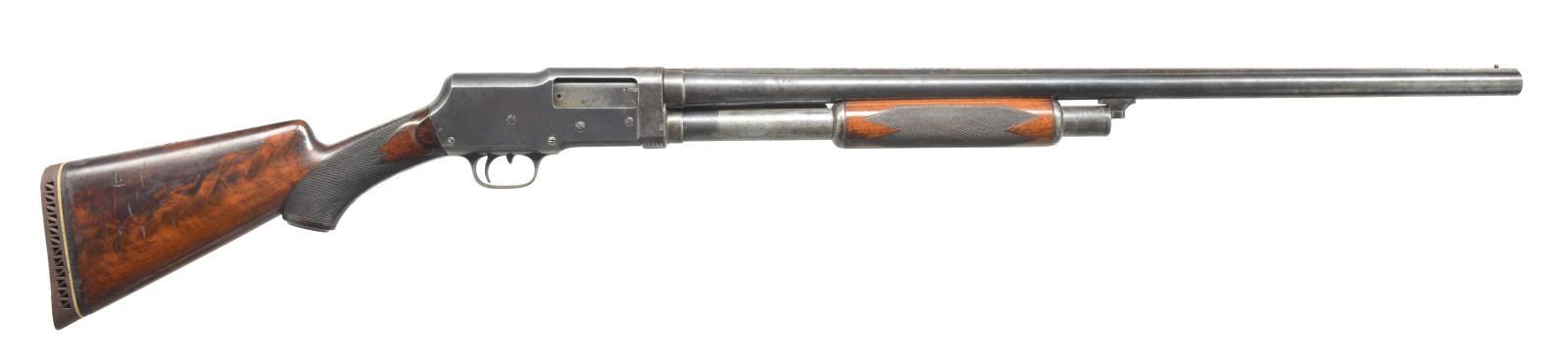 1) J STEVENS MODEL 525 PUMP. Cal. 12 Ga. S# 36797. Bbl. 28" solid rib. Brass bead front sight. Top of rib is matted. Checkered forend. Checkered pistol grip w/ black hard rubber grip cap & brown vented white lined recoil pad. LOP: 13 1/4" over recoil pad. Upper left side of receiver is missing a screw. CONDITION: bbl. retains some original blue w/ considerable surface oxidation & wear on sharp edge of rib. Mag. tube has traces of original blue but is mostly silver blending w/ brown patina. Receiver has traces of original blue, mostly covered in surface oxidation. Forend has original finish w/ handling marks & short grain crack from rear metal ring to the edge of checkering. Checkering is good. Nicely figured buttstock has original finish w/ numerous dings & scratches & some marks at butt from installation of recoil pad. Good checkering. Bore is good. (20-3523/BT). 2) STEVENS MODEL 620 PUMP. Cal. 12 Ga., 2 3/4". NSN. Bbl. 21 1/2" top matted w/ Cutts compensator. Brass bead front. Cutts has tube marked “755”. Checkered forend. Uncheckered pistol grip stock w/ black hardwood grip cap & red vented Redhead recoil pad w/ 1/4" plexiglass spacer. Bbl. has good original blue w/ some thinning at chamber. Mag. tube has traces of original blue mixing w/ silver patina. Receiver has good original blue w/ some minor rust on sharp edge of lower right side & sharp edge wear. Forend has original finish w/ good checkering. Buttstock has coat of added finish w/ nicks & dings. Bore is good. (20-3526/BT). 3) SYRACUSE ARMS THE HOLLENBECK SXS. Cal. 12 Ga. S# 4490. Bbl. shortened to 20" w/ cyl. bores & lengthened forcing cones. Matted concave rib, brass bead front. Uncheckered forend. Uncheckered rnd. knob pistol grip. 1/2" Thick hard rubber buttplate. Right side of stock is stamped “LWERY TROUGHS”. Right side also marked “ANBRUS”. Left side is scratches w/ “SEVEN” & “TROUGHS”. CONDITION: Damascus bbls. have a lot of original brown w/ some minor pits. Receiver is mostly a brown mixing w/ silver patina. Forend has coat of added finish w/ numerous handling marks & a short crack on bottom center. Buttstock has a screw installed right behind receiver, showing cracks off from top tang. Light coat of oil or added finish w/ hand wear in grip area. Bores are rough w/ many pits. (20-3602/BT). ALL MODERN. $800-1,200.