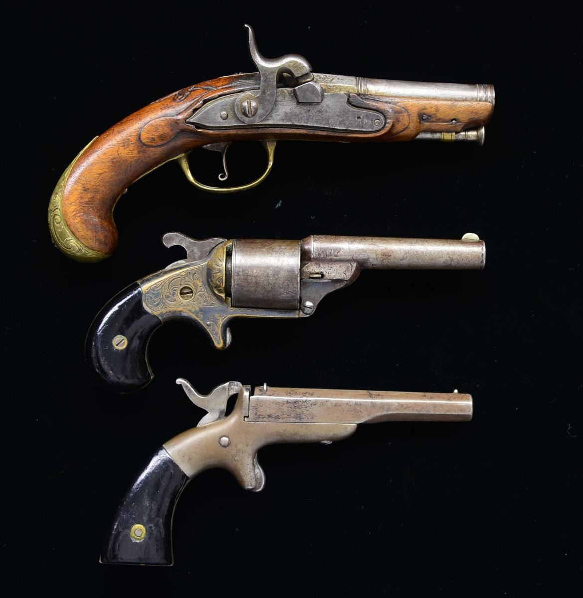 1) EUROPEAN FLINTLOCK POCKET PISTOL CONVERTED TO PERCUSSION. Cal. 42 Rifled bore. NSN. 3 1/2" Oct. to rnd. bbl. w/ turned rings. Converted to percussion w/ drum & nipple. Sm. lock w/ arched plate w/ percussion hammer. Walnut stock is brass mounted & has relief carving behind bbl. tang & w/ drop points & shadow lines around lock. Rear portion of bbl. & furniture have some scroll engraving & there are grotesque masks on grip cap, trigger guard bow & at center of fancy sideplate. CONDITION: very good. Retains most of what appears to be its refinish at time of conversion. Brass w/ old cleaning, toned back to mustard brown. Mechanically fine. (01-18708/MGM). 2) NATIONAL ARMS CO. MARKED MOORE’S PATENT FRONT LOADING TEAT FIRE REVOLVER. Cal. 32. S# 18923. 3 1/4" Bbl. is marked “NATIONAL ARMS CO BROOKLYN, N.Y.” on top. 6 Shot cyl. Marked w/ Williamson’s patent info. Silver plated brass frame is engraved w/ lg. open shaded scroll. Walnut grips w/ black lacquer. CONDITION: fair to good. Metal parts mostly brown patina w/ numerous marks. Frame retains approx. 30% silver plate, tarnished dark. Grips have been relacquered & retain nearly all of that lacquer. Mechanically good, except bbl. very loose on frame. (01-18709/MGM). 3) ALLEN & WHEELOCK CENTER HAMMER .32 CAL. SINGLE SHOT PISTOL. S# 200. 4" Bbl. w/ fixed sights & no extractor pivots to right & is marked “ALLEN & WHEELOCK” on left side, S# on bottom. Iron frame w/ no overlap is fitted w/ lacquered walnut grips. CONDITION: good. Iron parts are mostly grayish brown patina. Markings on side of bbl. very light. Grips w/ new black lacquer & a few subsequent marks. Action loose. Estimated production for these guns is between 500-1,000. (01-18710/MGM). ALL ANTIQUE. $400-800.