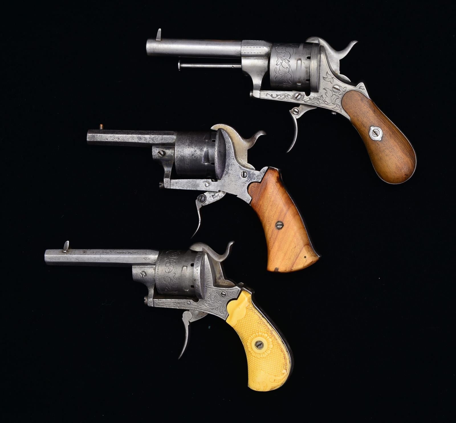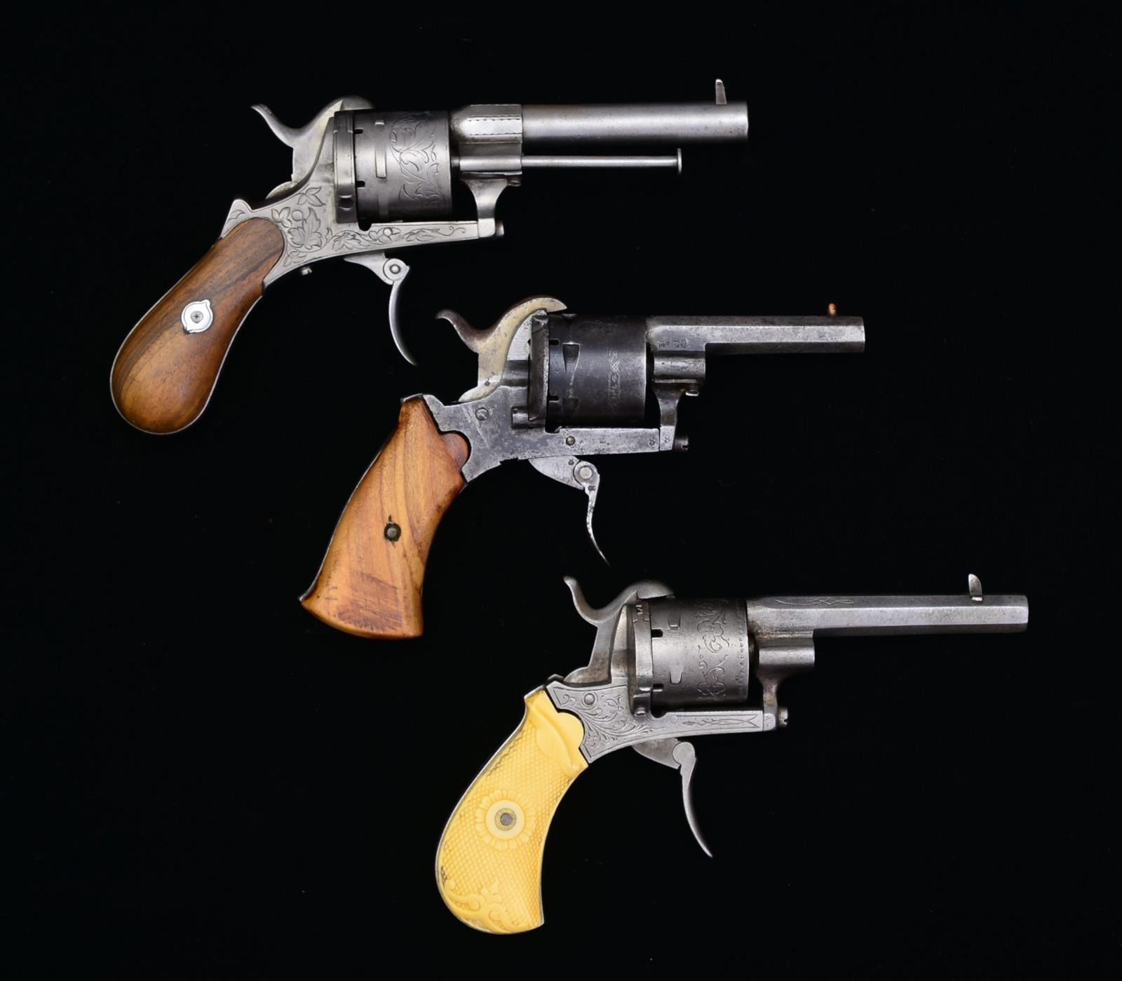 ALL: cal. 7.65mm Pinfire. NSN. 1) Bbl. 3 3/8" rnd. w/ oct. shank. Bead front sight. 6 Shot rnd. cyl. Open top folding trigger pinfire action. Frame & cyl. have vine type foliate engraving. 2 Piece walnut bag type grips. Cyl. has Belgian proof mark. CONDITION: metal has cleaned gray appearance. Good refinished grips. Functioning action. Bore retains intact rifling showing spots of pitting. (01-18532/DS). 2) THE GUARDIAN AMERICAN MODEL 1878. Bbl. 2 1/2" oct. w/ brass bead sight. 6 Shot rnd. cyl. w/ Belgium proof mark. Open top folding trigger pinfire action. 2 Piece walnut replacement grips. CONDITION: metal shows cleaning w/ general light pitting. Grips are poorly fit. Action does not cycle properly. Dark pitted bore. (01-18533/DS). 3) Bbl. 3 1/4" oct. w/ blade sight. 6 Shot rnd. cyl. Open top folding trigger pinfire action. Frame & cyl. have foliate hand engraving. 2 Piece checkered synthetic ivory grips. CONDITION: metal has cleaned gray appearance. Grips show wear. Functioning action. Pitted bore. (01-18534/DS). ALL ANTIQUE. $300-500.