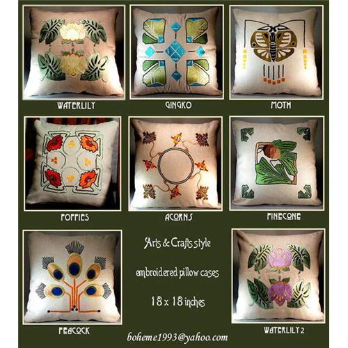 If you are REALLY interested in this item, please note that for Ebay Live Auction only bids at or above $190 will be successful and meet our reserve. Our exclusive - not available by any other seller, Gallery or Studio. Outstanding Arts & Crafts / Mission style decorative pillow cases in 8 different styles / patterns. These pillows will immediately enhance the character and charm of any room in which it is placed. Each design was hand drawn, hand traced and embroidered on an old Singer sewing machine, using what I believe is called "lock stitch". This type of embroidery will not run, like "straight" stitch. There is no (much less expensive) stenciling or appliqué used in this process. Each pillow is 18" x 18" and embroidered on a fine canvas linen. The (more expensive) addition of a zipper on one seam allows for each owner to independently choose their own filling, while also making cleaning far easier. No Arts & Crafts home is complete without the addition of fine pillows. Please note that this auction is for the pillow cases only. Pictured are 8 styles we have - Poppies #1, Ginkgo #2, Peacock #3, Moth #4, Pinecones #5, White Waterlily #6, Mauve Waterlily #8 and Acorns #17. You are buying 3 pillow cases of your choice - mix or match. Comparables are offered at Galleries or Studios in the price range of $150-$250 per pillow. Please note that for Ebay Live Auctions photo sizes are automatically reduced, so if you want to see full size or detailed pictures, please email us.