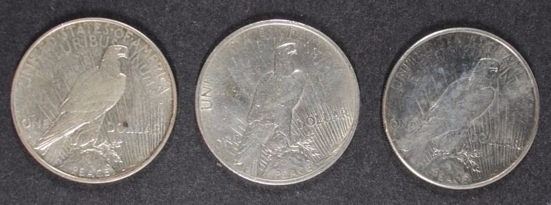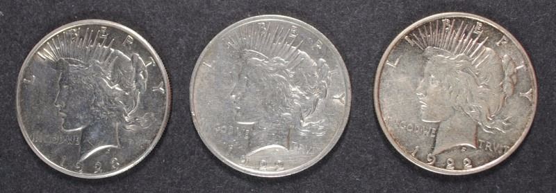 3 - AU PEACE DOLLARS; 1922, 1922-D & 1923-S