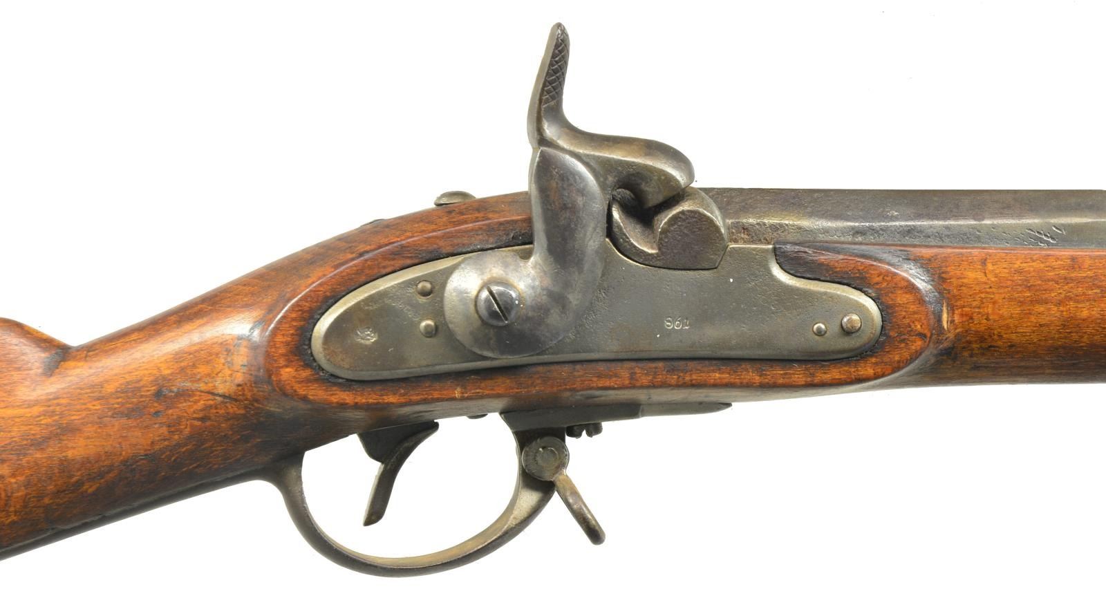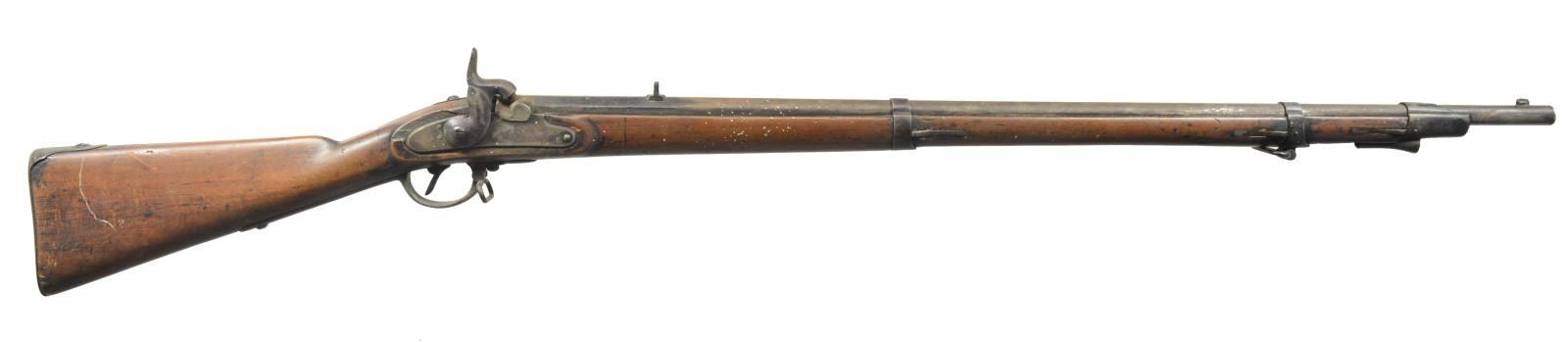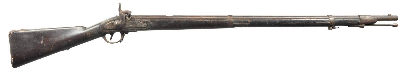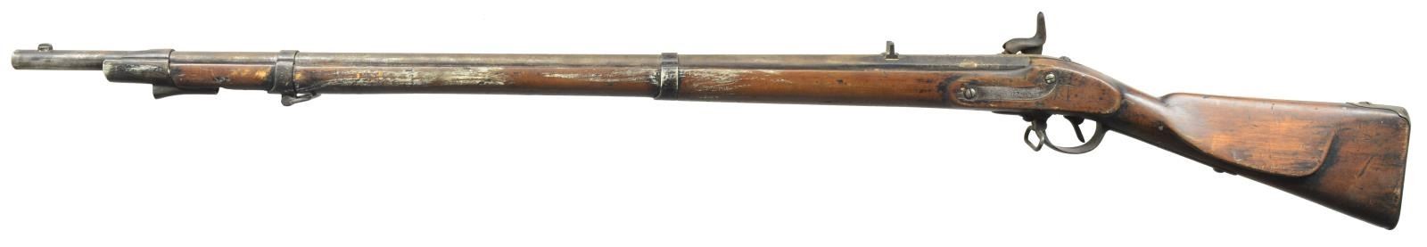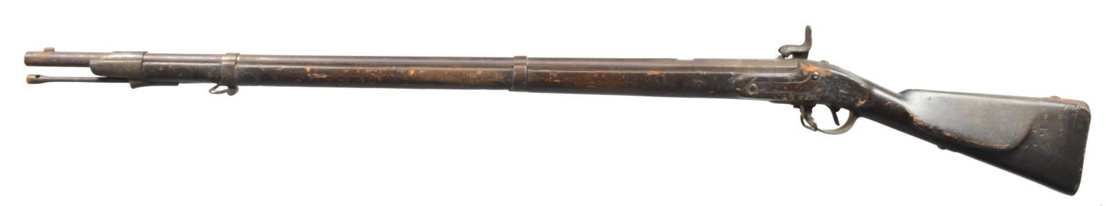 ALL: bbls. 37 3/8" w/ oct. shanks. 1) Cal. 54. NSN. Rifled bore. Barleycorn front sight, rear sight is removed. Bbl. & lock are both marked "S 60". 3 Band walnut stock w/ iron fittings & ramrod. CONDITION: metal has faded to a mottled brown patina showing light pitting. Stock has dark worn appearance w/ heavy dents & gouges. Dark pitted bore. (01-18224/DS). 2) Cal. 62. S# 876. Smooth bore. Lock marked "S 61". Blade front sight & folding leaf rear sight. 3 Band fastened hardwood stock. CONDITION: metal has cleaned appearance reacquiring a dark tarnish w/ pitting in breech area. Refinished stock shows wear & handling marks. Dark pitted bore. (01-18245/DS). 3) Cal. 54. NSN. Rifled bore. Blade front sight & fixed V notch rear sight. Lock marked "S 58". 3 Band fastened hardwood stock w/ iron fittings. CONDITION: metal has a mottled patina appearance showing dents in breech area. Wood shows wear & handling marks w/ chips around lock & top tang. Ramrod is missing. Bore is plugged 8 3/4" from muzzle. (01-18296/DS). ALL ANTIQUE. $800-1,200.
