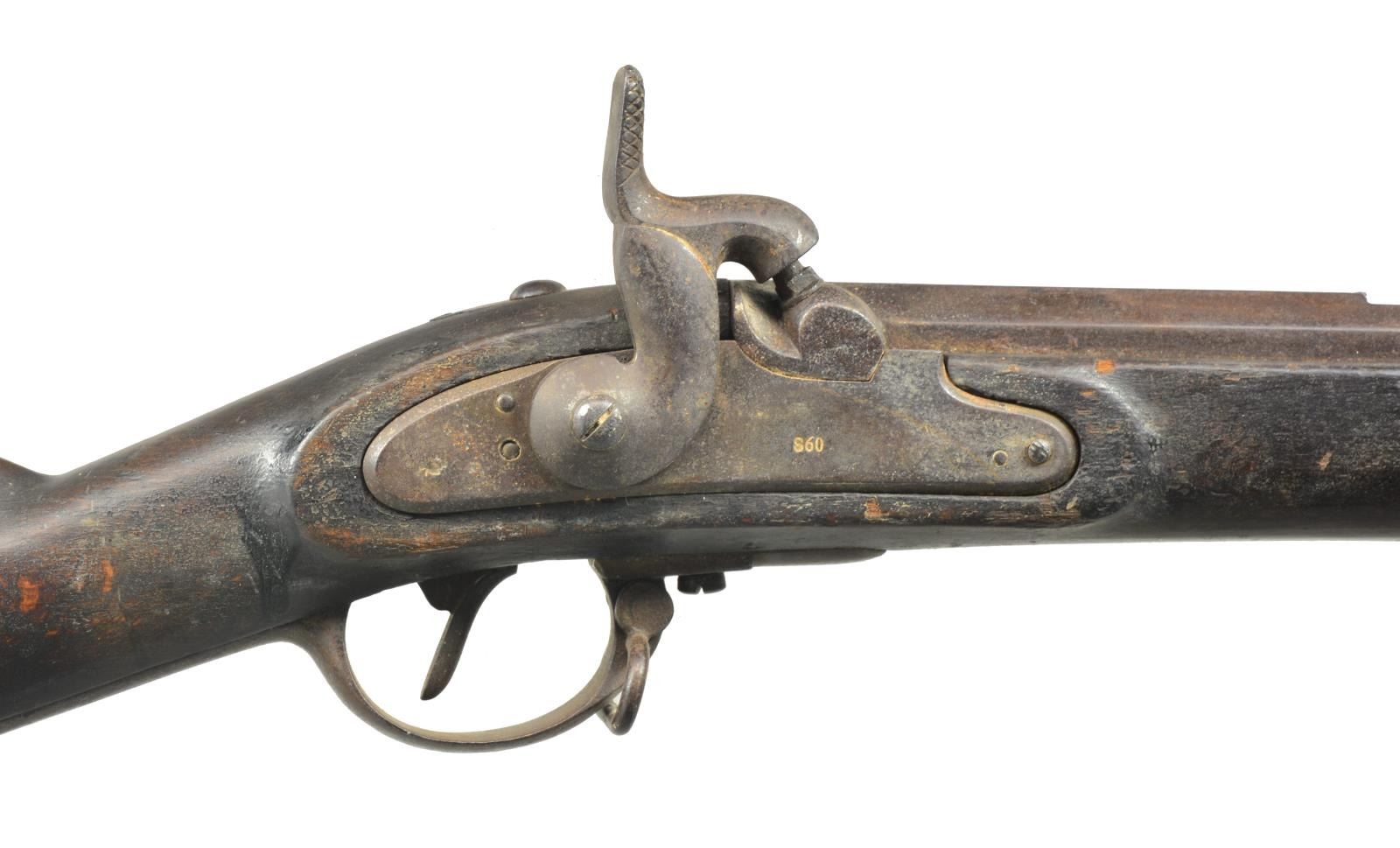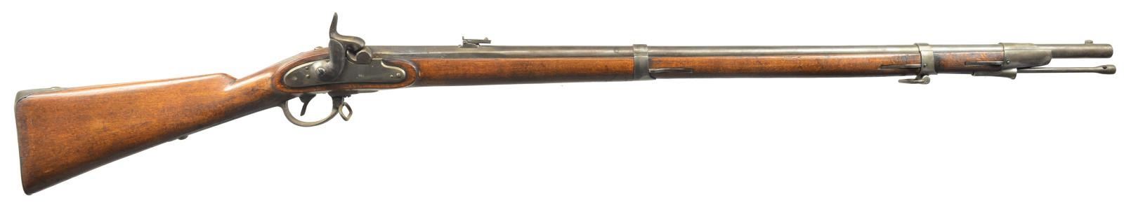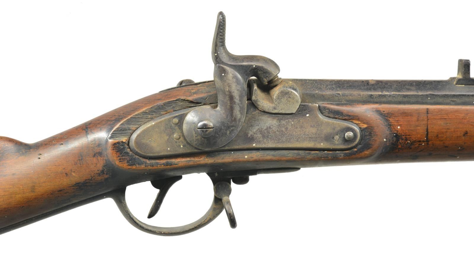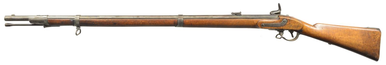 ALL: bbls. 37 3/8" w/ oct. shanks. 1) Cal. 54. NSN. Rifled bore. Barleycorn front sight, rear sight is removed. Bbl. & lock are both marked "S 60". 3 Band walnut stock w/ iron fittings & ramrod. CONDITION: metal has faded to a mottled brown patina showing light pitting. Stock has dark worn appearance w/ heavy dents & gouges. Dark pitted bore. (01-18224/DS). 2) Cal. 62. S# 876. Smooth bore. Lock marked "S 61". Blade front sight & folding leaf rear sight. 3 Band fastened hardwood stock. CONDITION: metal has cleaned appearance reacquiring a dark tarnish w/ pitting in breech area. Refinished stock shows wear & handling marks. Dark pitted bore. (01-18245/DS). 3) Cal. 54. NSN. Rifled bore. Blade front sight & fixed V notch rear sight. Lock marked "S 58". 3 Band fastened hardwood stock w/ iron fittings. CONDITION: metal has a mottled patina appearance showing dents in breech area. Wood shows wear & handling marks w/ chips around lock & top tang. Ramrod is missing. Bore is plugged 8 3/4" from muzzle. (01-18296/DS). ALL ANTIQUE. $800-1,200.