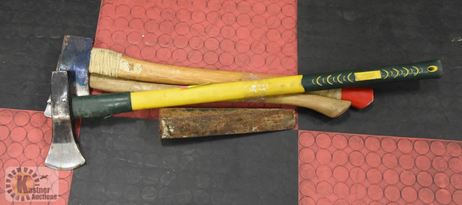 3 AXES - 1 SPLITTING, 2 W/ WOOD HANDLES AND LARGE