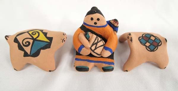 3 Native American Acoma Pottery Figures by D Chino. Signed on the bottom we have one storyteller figure and 2 turtles. The largest of these measures approx. 2.5''T x 2''W x 2.5''D.