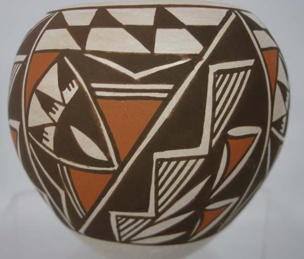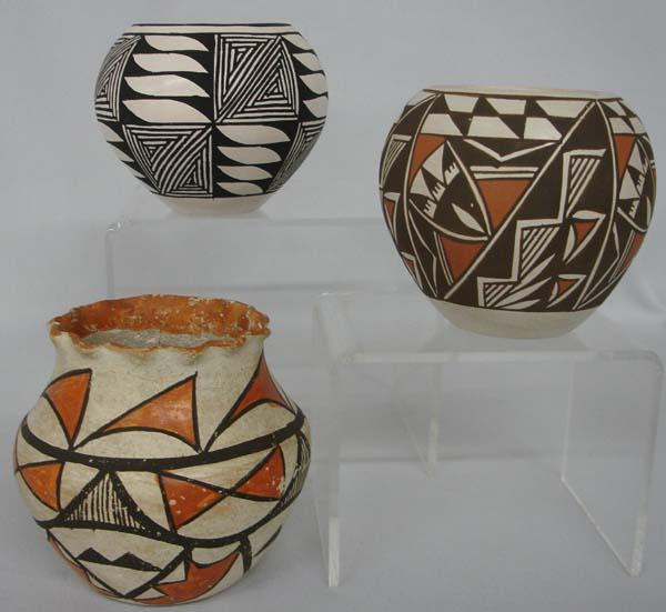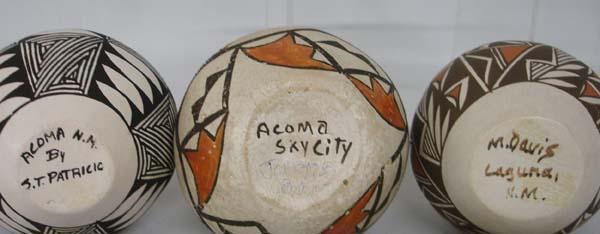 3 Acoma Pottery Jars Hallmarked. The largest measures 3''x3.5'' and has the scalloped rim. All are hallmarked on the bottom. Patricio, & Davis are two of the potters. The other one is too hard to read. SHI $30