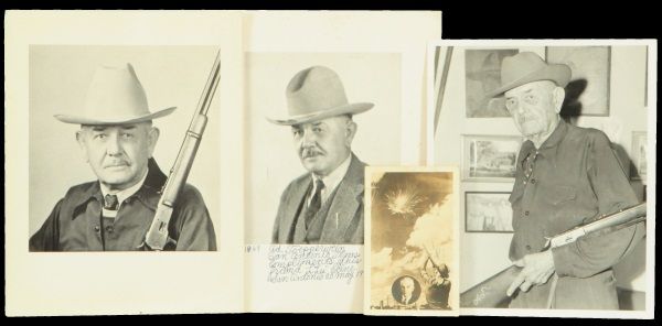 1962 Photo Compliments of Friend L. 'Les' Cline" (8-3/4" x 10-1/2"); Postcard to Les Cline postmarked 1942; Photo with Winchester 92 (8-1/2" x 11"); and Later photo (8" x 10").