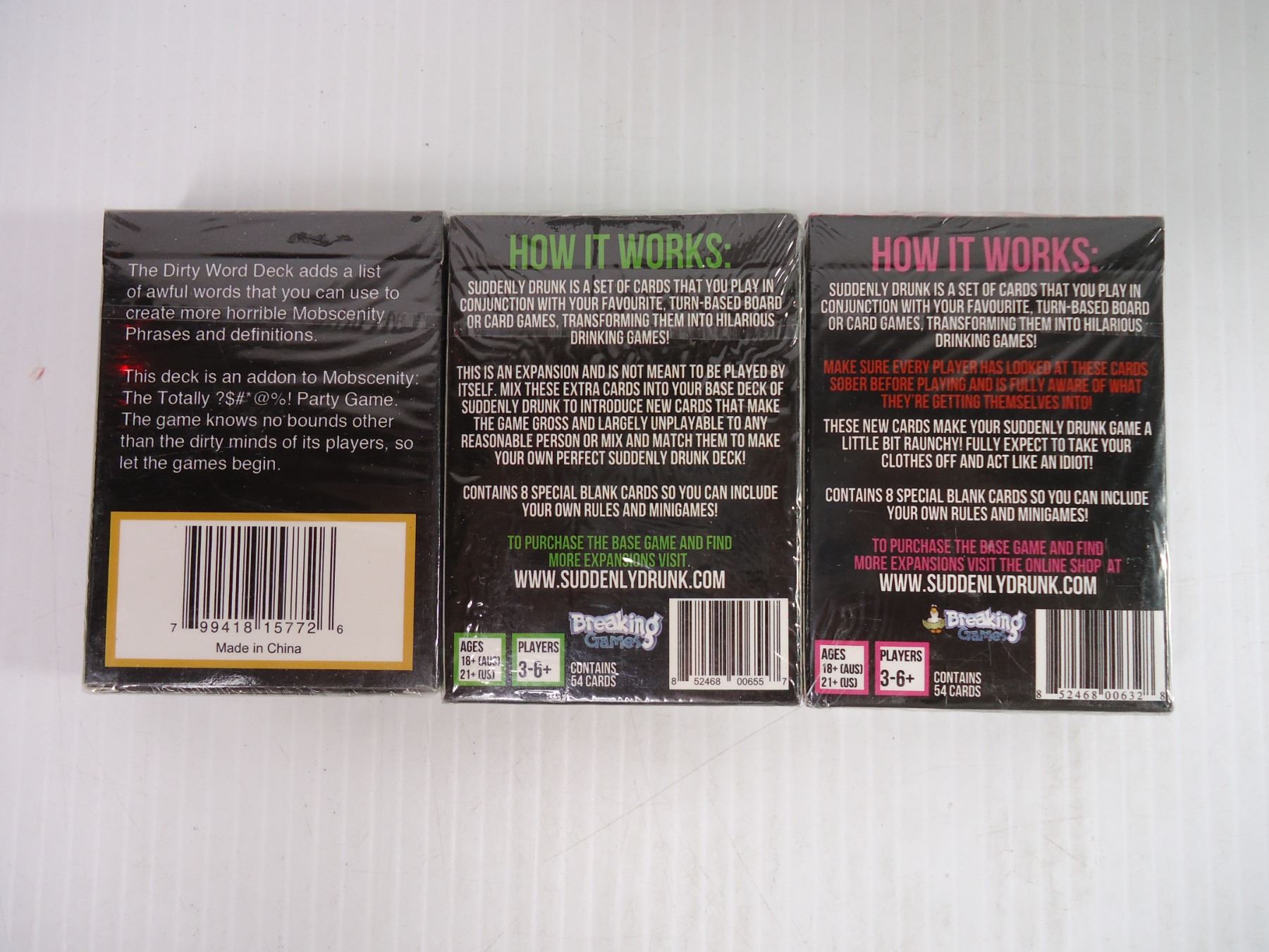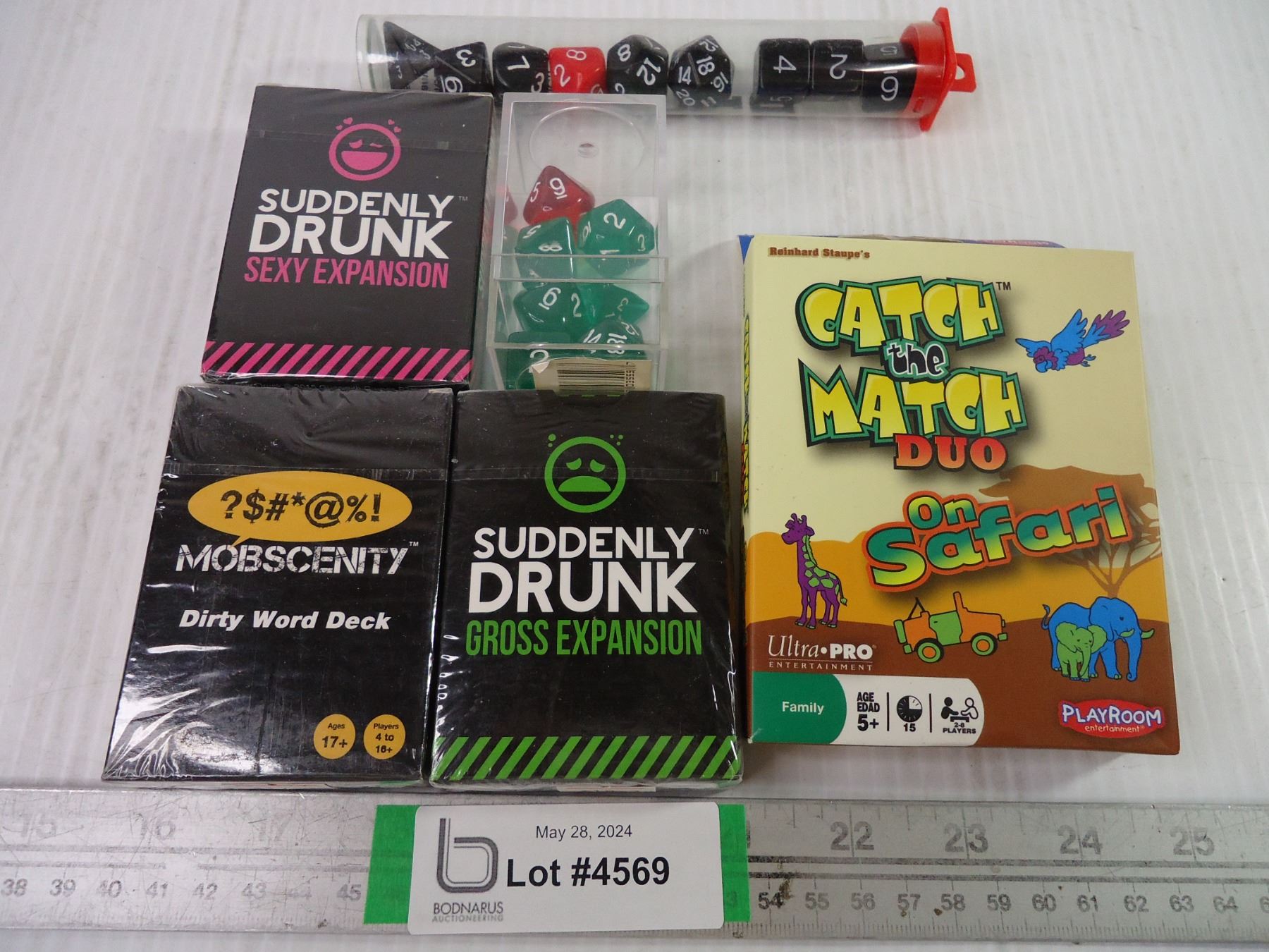 (3) Adult Card Games, Catch the Match Game and (2) Containers of various dice