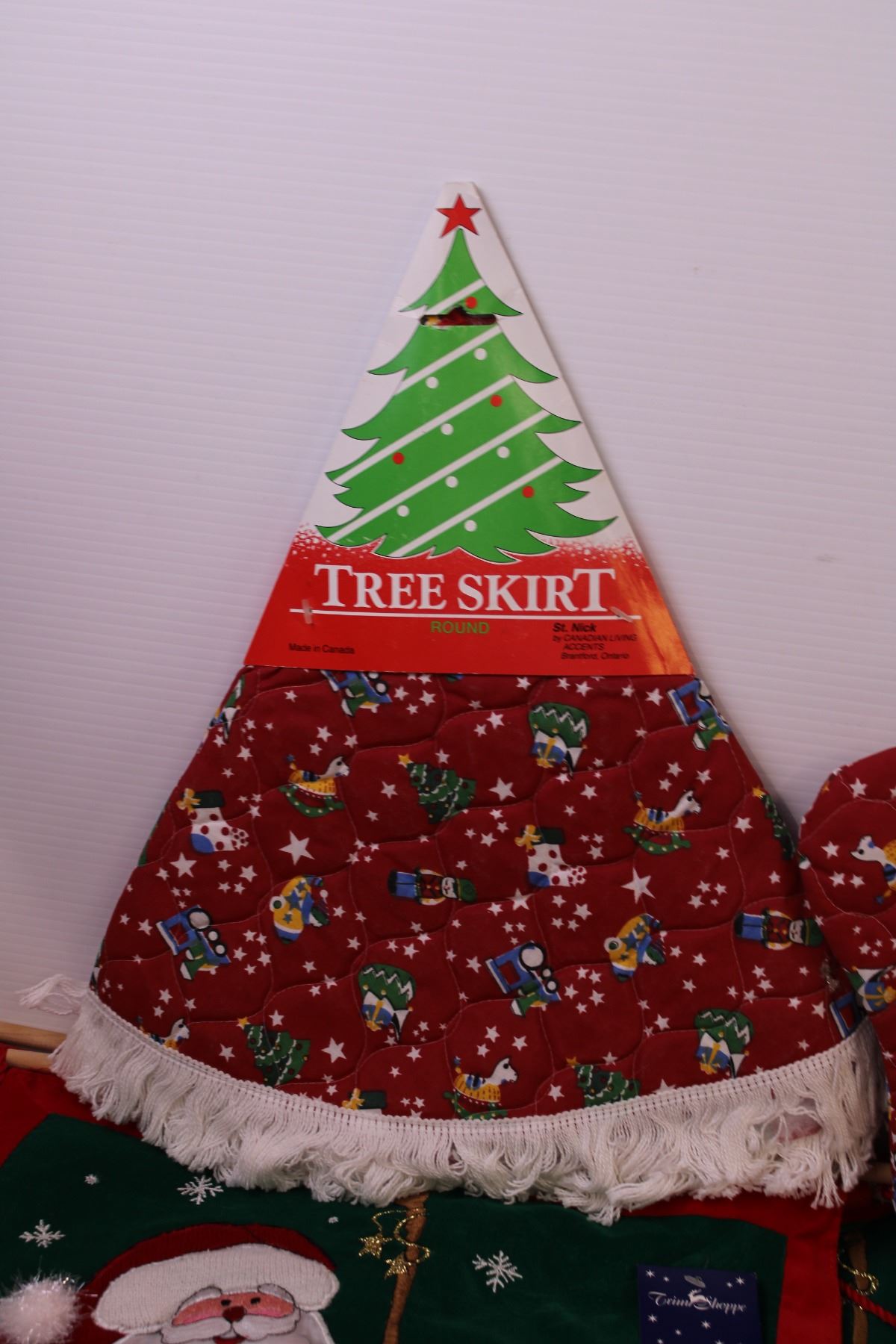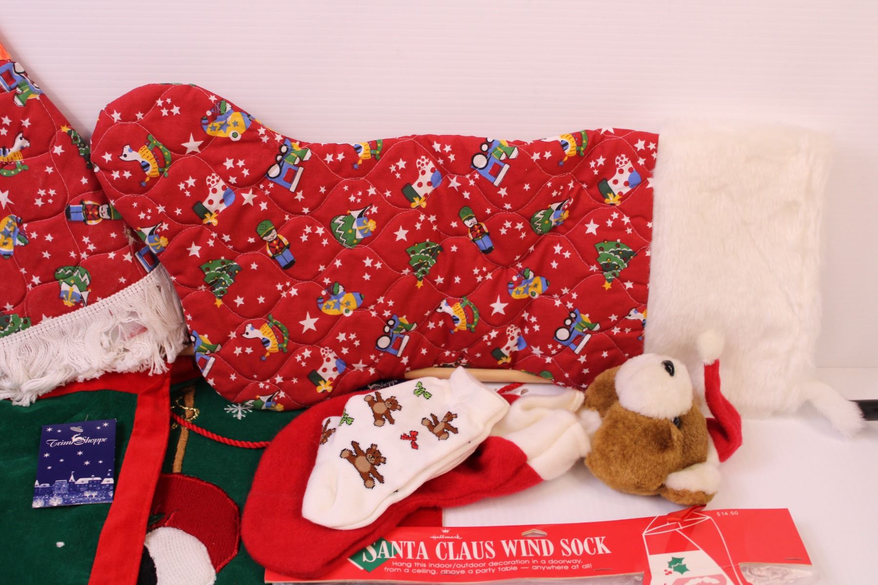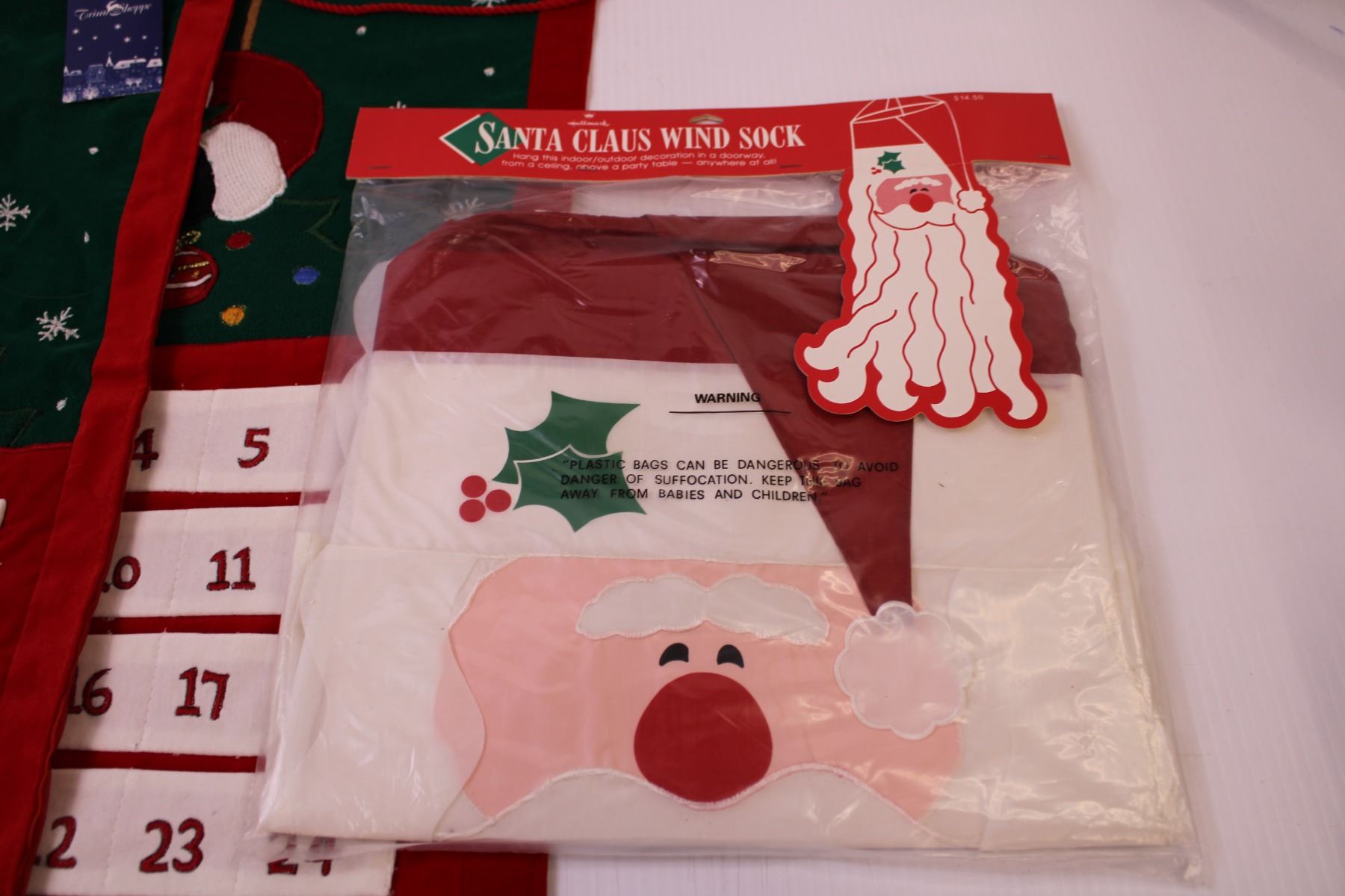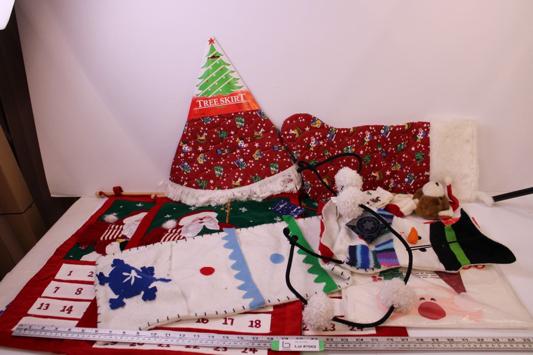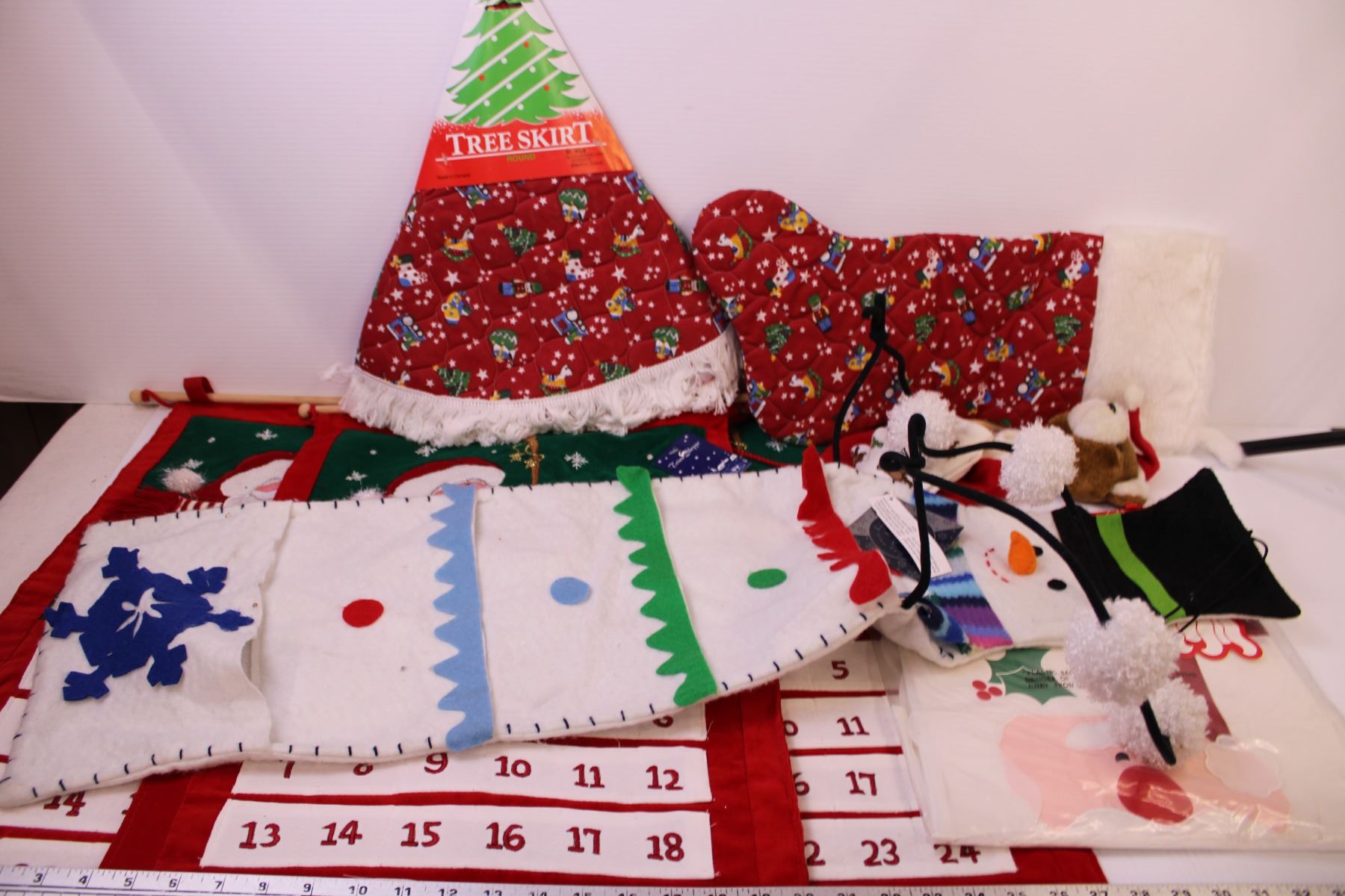 (3) Advent Calendars, Snowman Card Holder, Tree Skirt, Santa Windsock, (2) Stockings