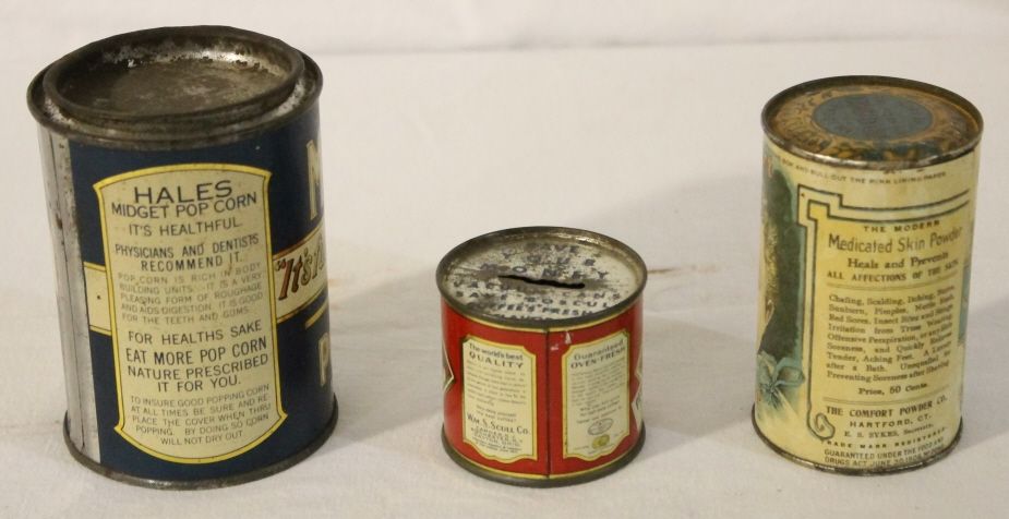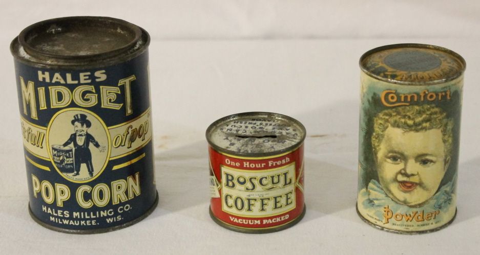 Comfort Powder, Boscul Coffee, & Midget Popcorn. One is a bank. 4", 4 1/2", 2" tall. 3x the money
