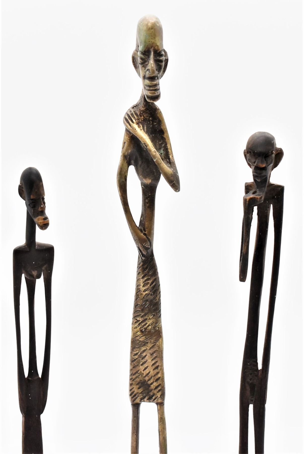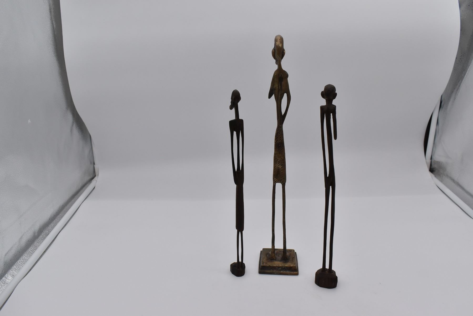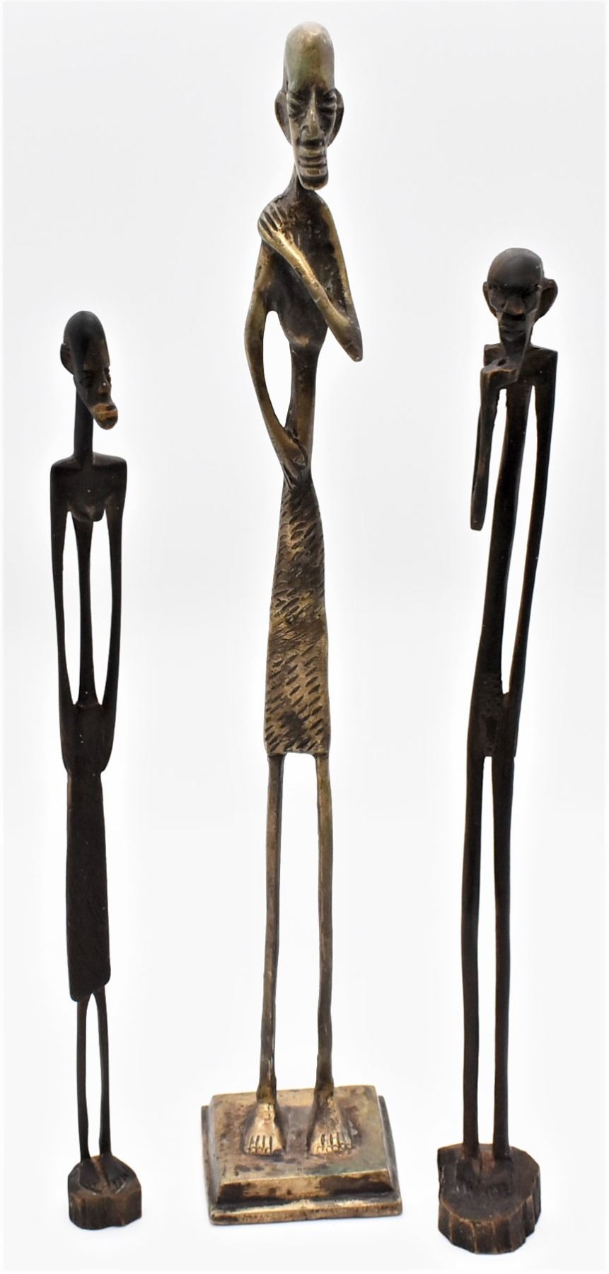 3 African Collectibles, includes 1. Brass Male Statue, measures 14 3/8''H x 2 3/8'' x 2 3/8'' 2. Two Carved Wood Male and Female Statues, tallest measures 12''H x 1.25''W