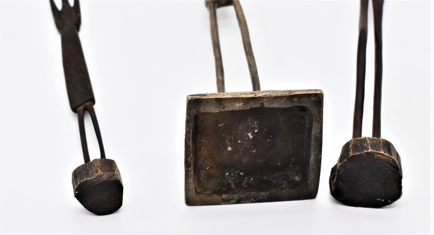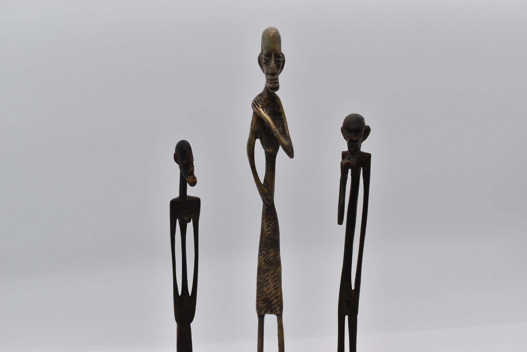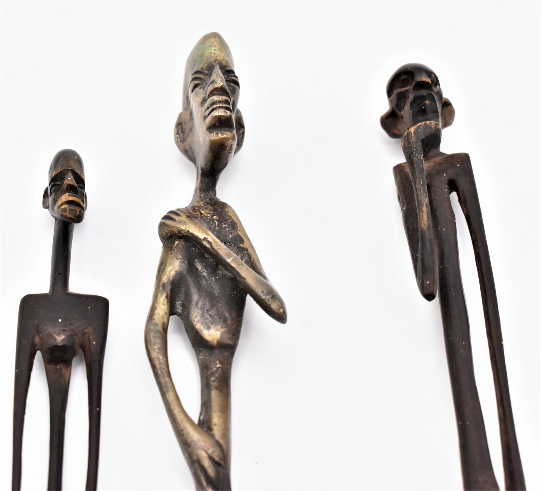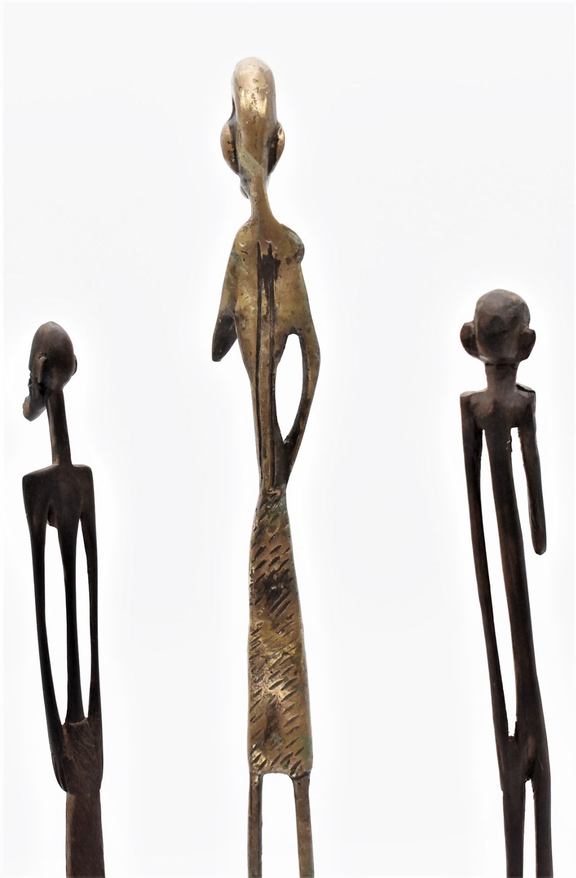 3 African Collectibles, includes 1. Brass Male Statue, measures 14 3/8''H x 2 3/8'' x 2 3/8'' 2. Two Carved Wood Male and Female Statues, tallest measures 12''H x 1.25''W