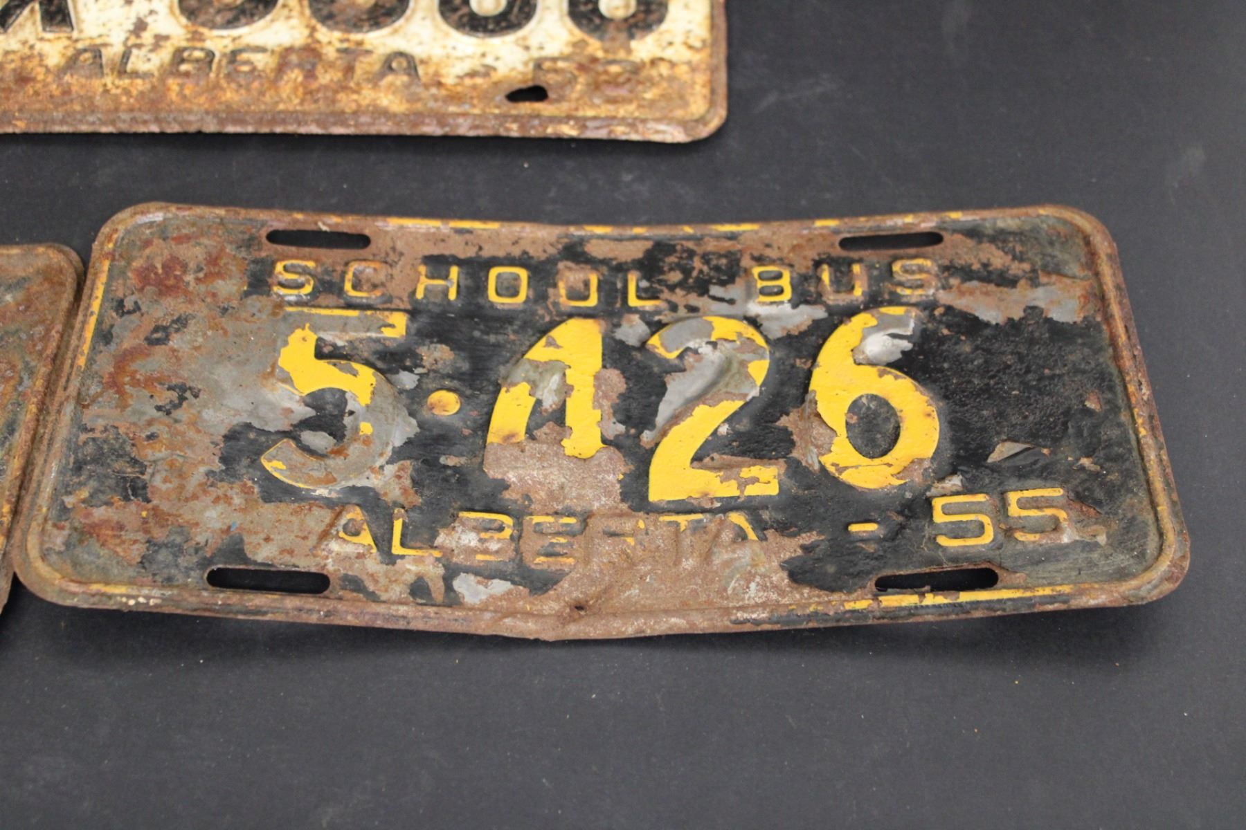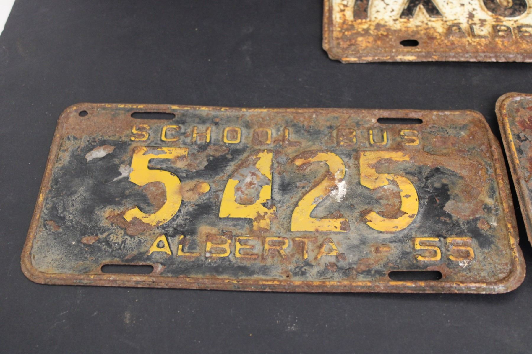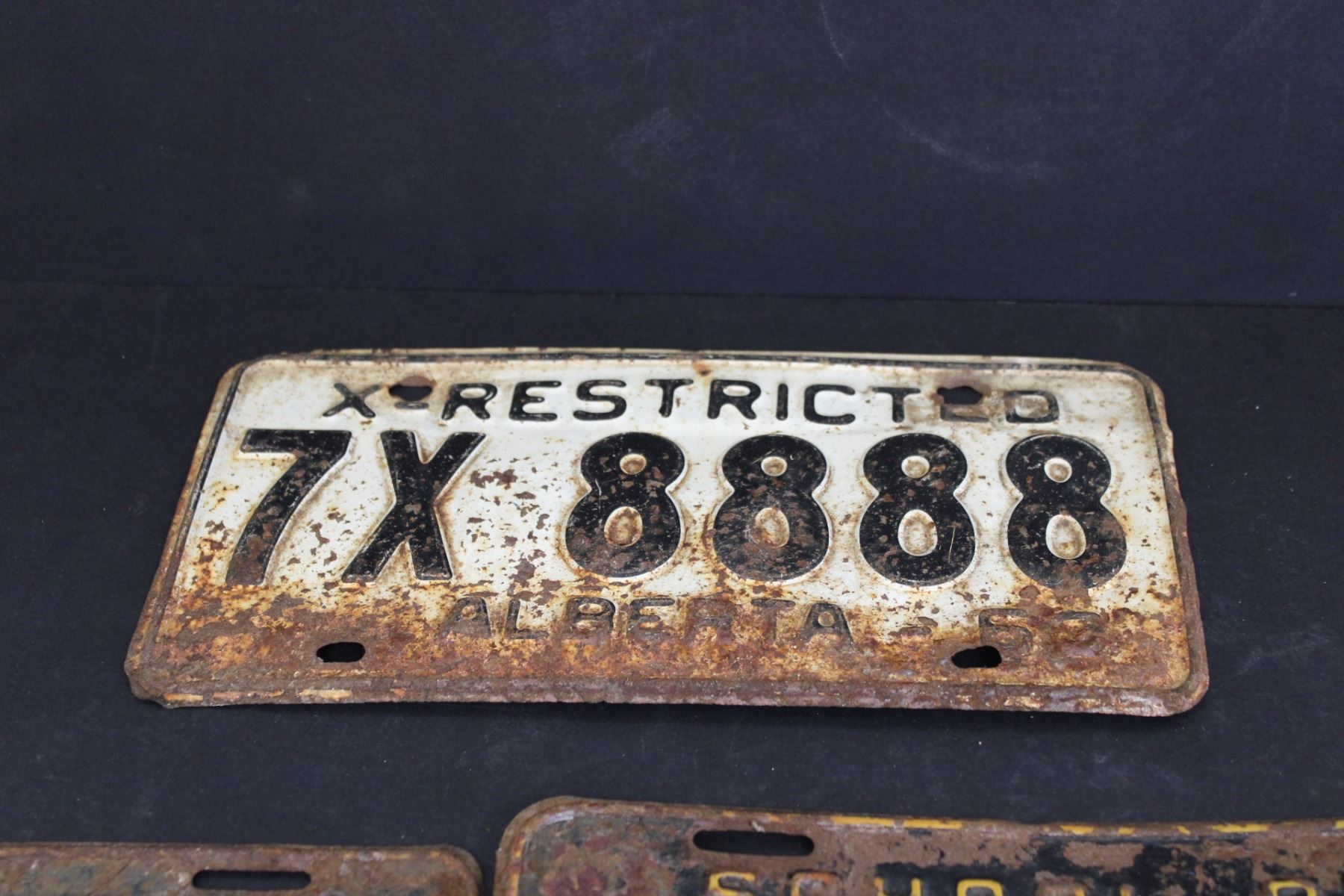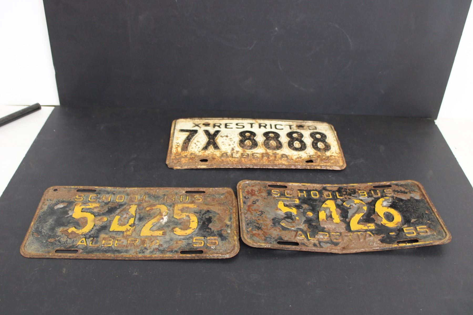 (3) Alberta License Plates - (2) 1955 School Bus Plates and 1963 X-Restricted Plate
