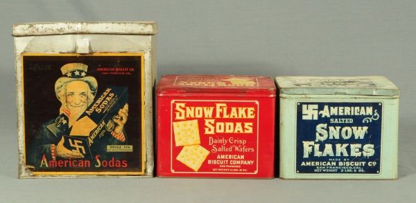 2 Snow Flake Sodas tins and 1 American Sodas tin, rolling logs. Largest measures 10" wide x 10" deep x 12" tall.