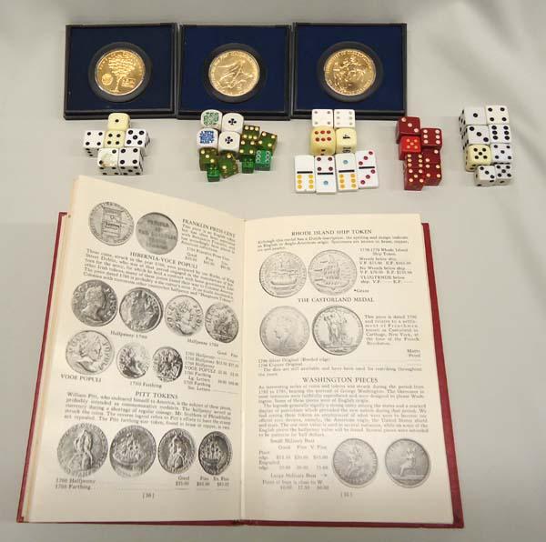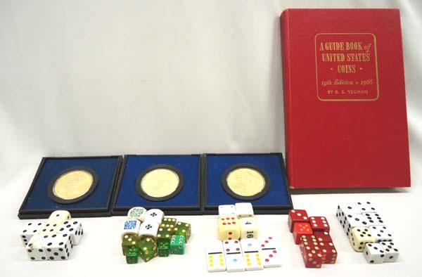 3 American Revolutionary Bicentennial Coins Plus Hardback book ''A Guide of United States Coins, 19th Edition 1966 by R.S. Yeoman. 4 dominoes and 37 dice. Buyers Pay Actual Shipping and Handling Charges(see terms and conditions for more information).