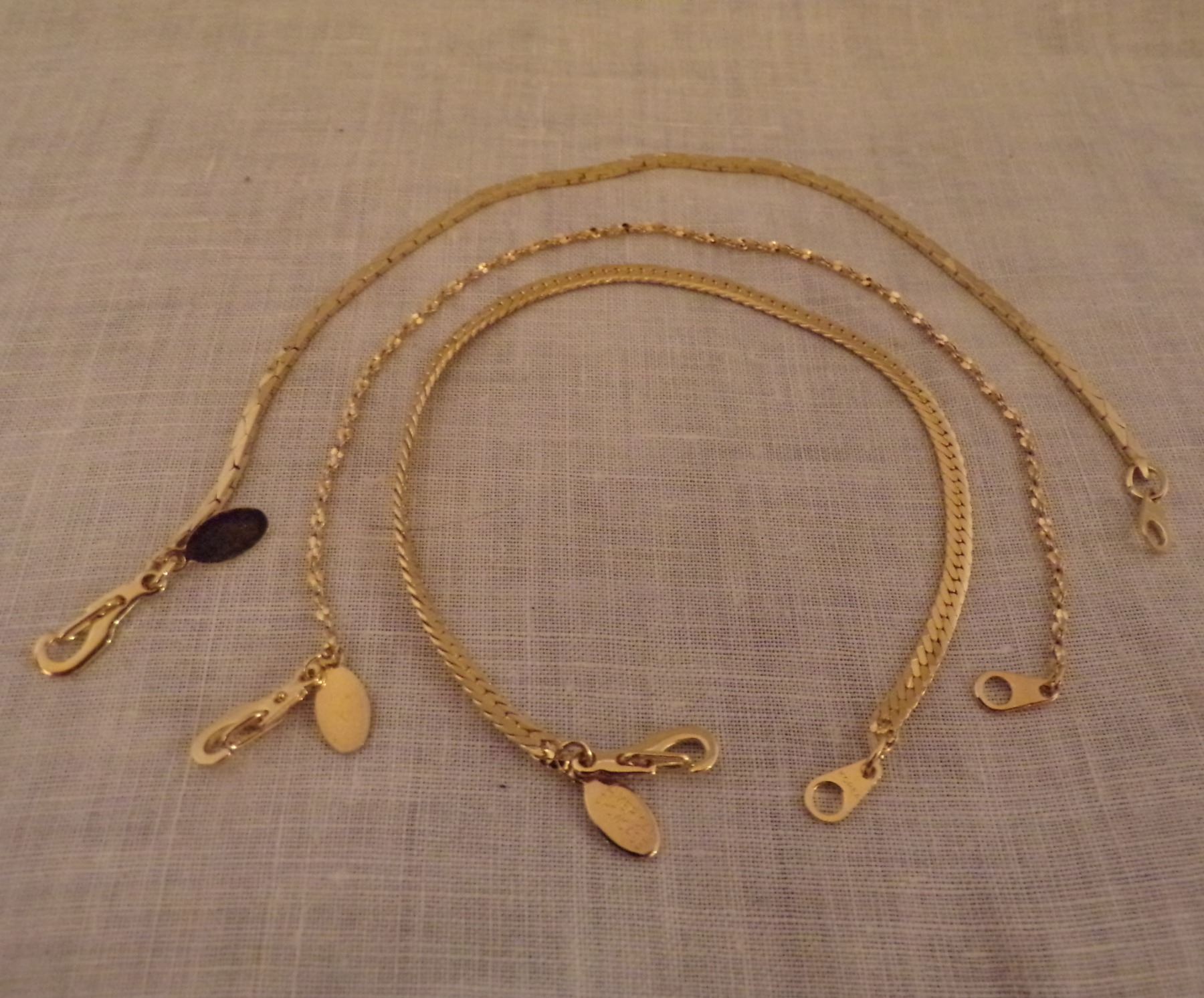 3 American Showcase Gold-Tone Bracelets, all three measure 7'' and each is secured with lobster-style safety closures, the chain styles are Snake, Foxtail, and Diamond Cut Rope, each bears the ''American Showcase'' hang tag