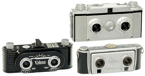 3 amerikanische Stereo-Kameras 1) Stereocrafters, Milwaukee. "Videon", 1950, Nr. 5576, Ilex "Stereon 3,5/35", selbstspannender Verschluß. (3/3) - Und: 2) Universal Camera, New York. "Stere-All", 1954, Nr. 4078, "Tricor 3,5/35", Fixfokus, Ein-Zeiten-Verschluß. (3-/3) - Sowie: 3) Kinder, Milwaukee. "Kin-Dar", 1954, Nr. 2210, Steinheil "Cassar 3,5/35", gekuppelter Entfernungsmesser. Mit Tasche. (4/3)