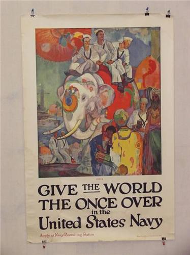 3 American WWI Posters, "India – Give the World the Once Over in the United States Navy etc.", Artist-James H. Daugherty, Printer-Press Navy Recruiting Bureau-NY, 42" x 28", Condition – Poor/Fair: Large Areas of Staining, Corner Losses and Breakaway Tears, Border Tears, Fold, Compression, and Corner Creasing, Wrinkling, and Soiling,