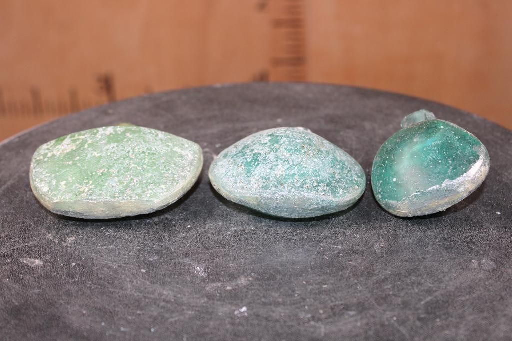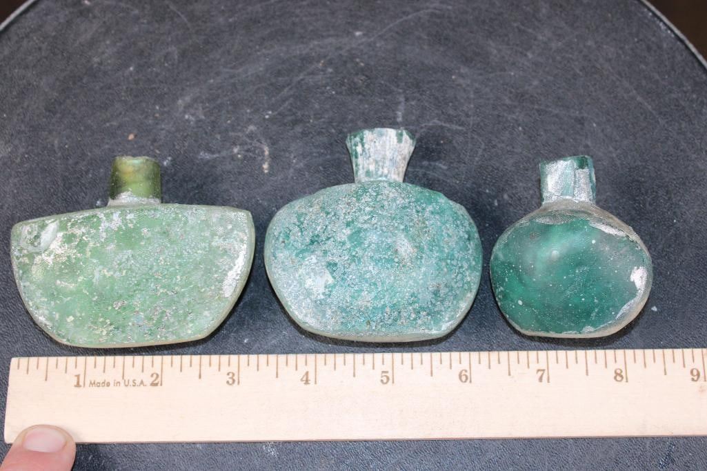 3 Ancient Roman Glass Bottles from the Roman Empire.The Green bottle measures 3.25" Tall x 2.75" Wide. And the Aqua colored Bottles measure 3" Tall x 3" Wide and 2.5" Tall x 2" Wide. The Total Weight is 7 oz.?