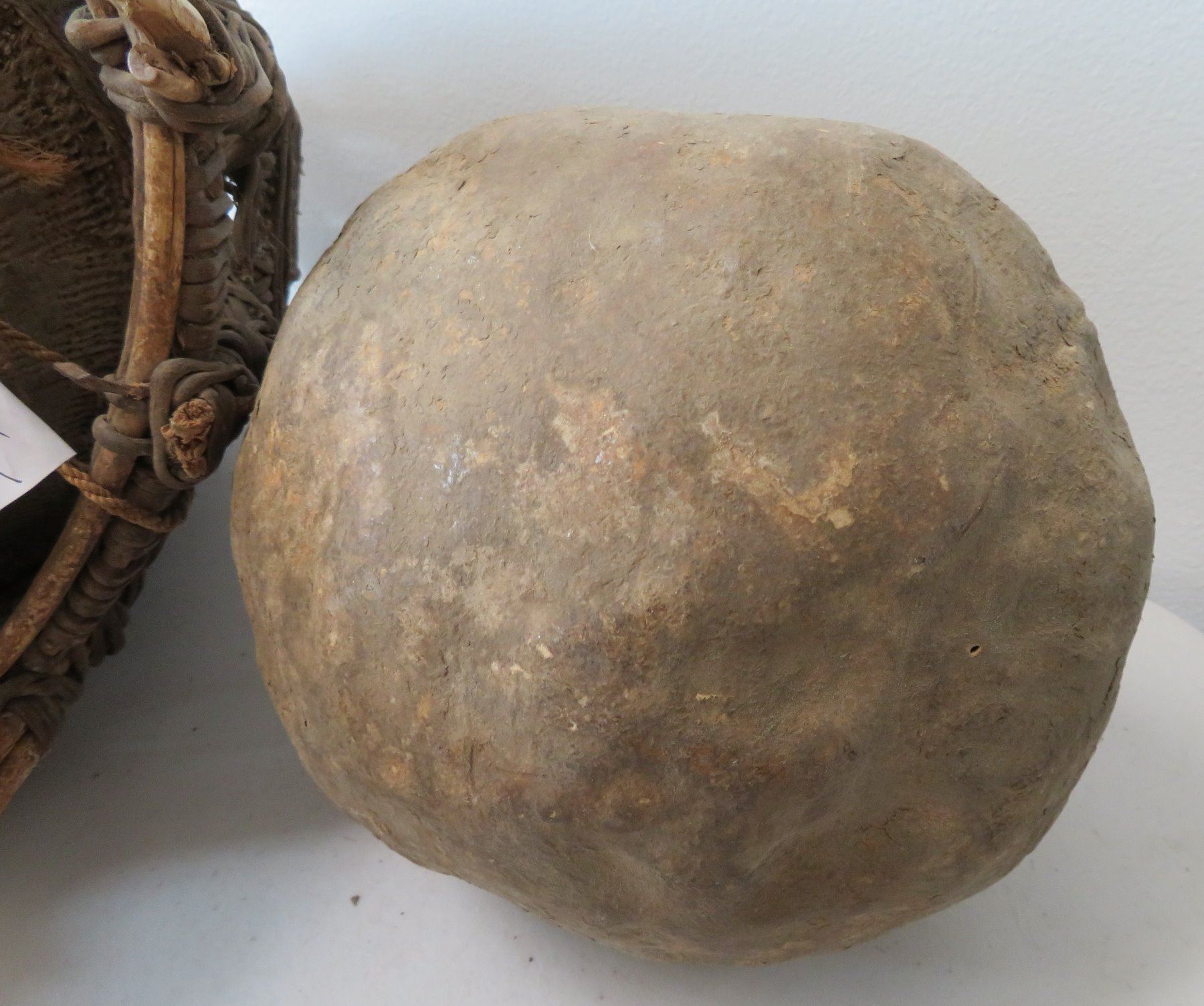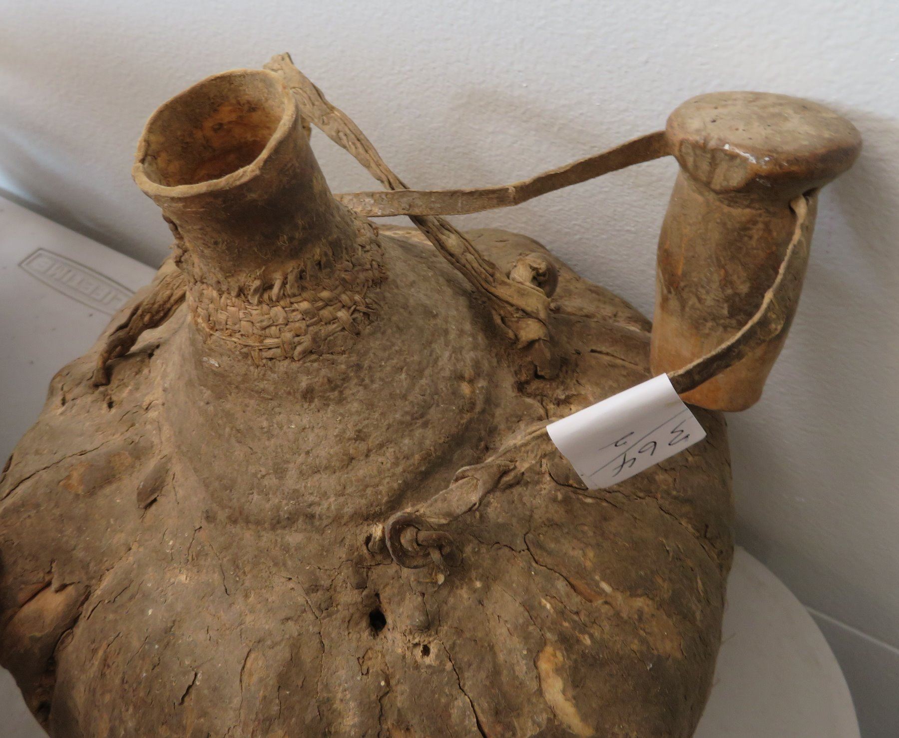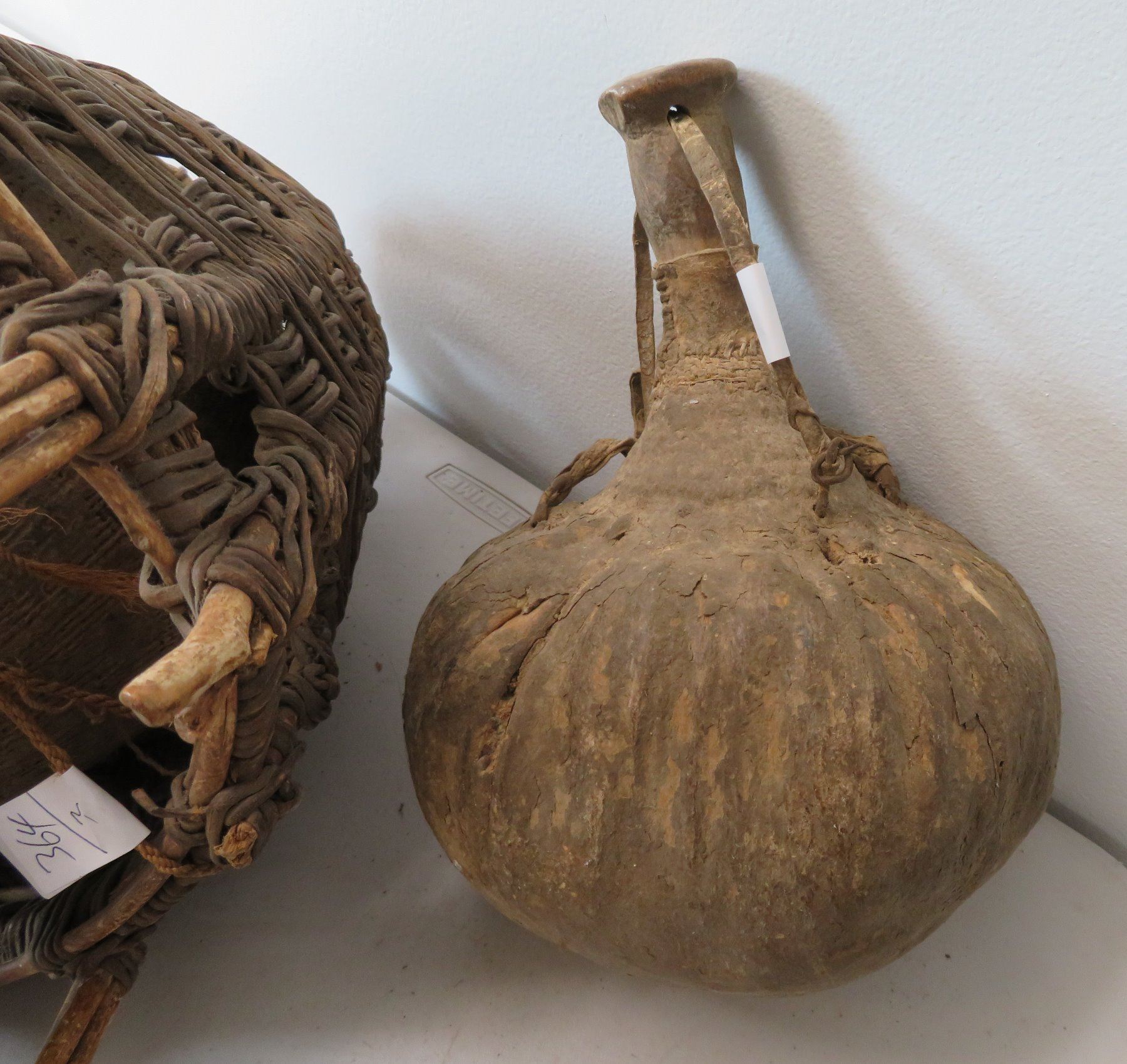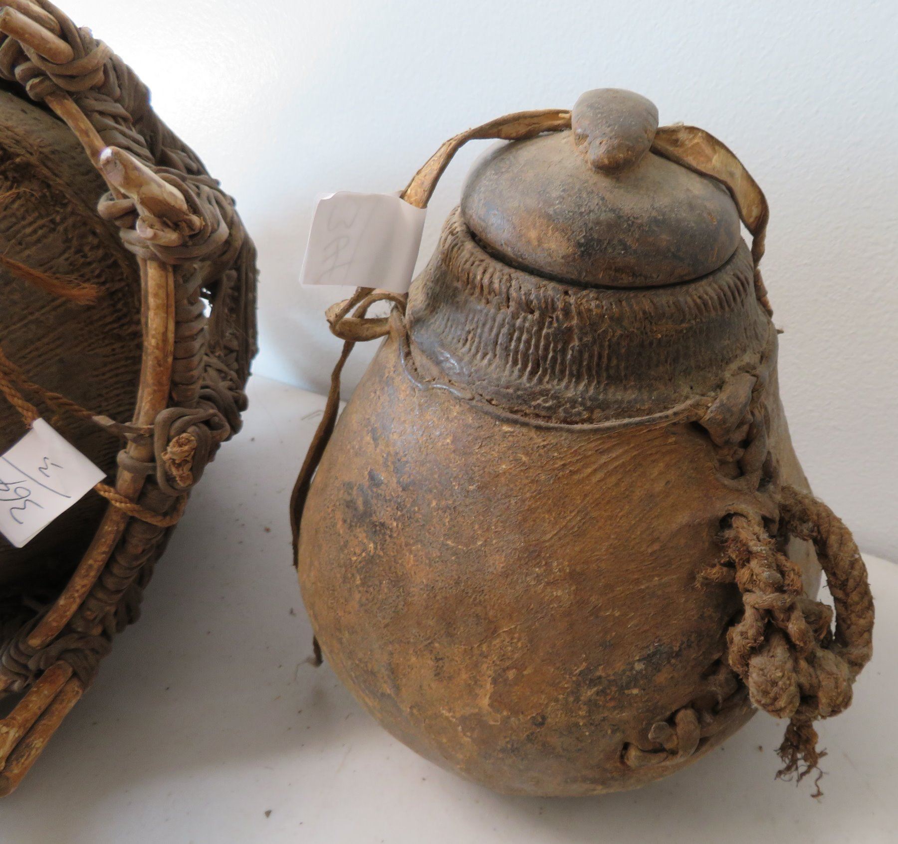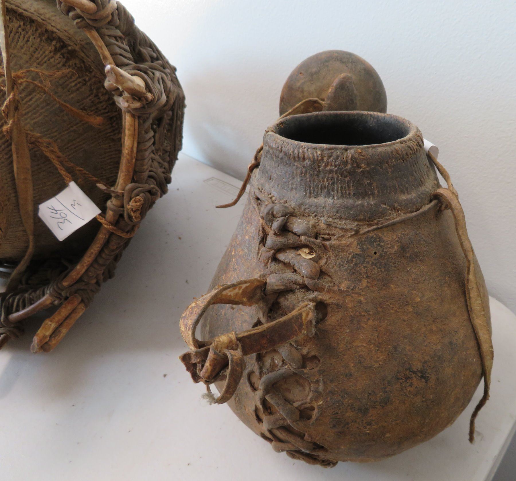3 Antique African Containers, c. 1930s. Made of wood, fiber and leather, the largest item measures 16" x 12". Masai, South Africa. Condition: All worn and used, see images. Shipping: $60.00 w/insurance and signature, due to size.